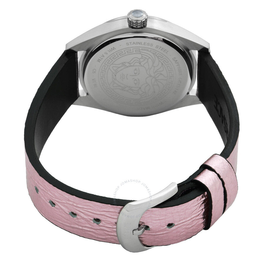 Silver-tone stainless steel case with a pink leather strap. Fixed silver-tone stainless steel bezel. Pink dial with silver-tone hands and index hour markers. Minute markers around the outer rim. Dial Type: Analog. Quartz movement. Scratch resistant sapphire crystal. Pull / push crown. Solid case back. Round case shape, case size: 36 mm. Tang clasp. Water resistant at 50 meters / 165 feet. Functions: hour, minute. V-code Series. Dress watch style. Watch label: Swiss Made. Versace V-Code Quartz Pink Dial Ladies Watch VE8I00124.