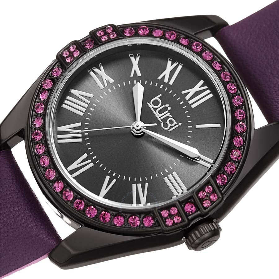 Black alloy case with a black leather with coloured edges strap. Fixed black crystal set bezel. Black dial with sword hands and Roman numeral hour markers. Minute scale around the inner rim. Dial Type: Analog. Quartz movement. Scratch resistant flat mineral crystal. Push/pull crown. Solid case back. Round case shape, case size: 36 mm, case thickness: 9.5 mm. Band width: 18 mm, band length: 7.5 inches. Buckle clasp. Water resistant at 30 meters / 100 feet. Functions: hour, minute, second. Casual watch style. Burgi Black Dial Ladies Watch BUR206PU.
