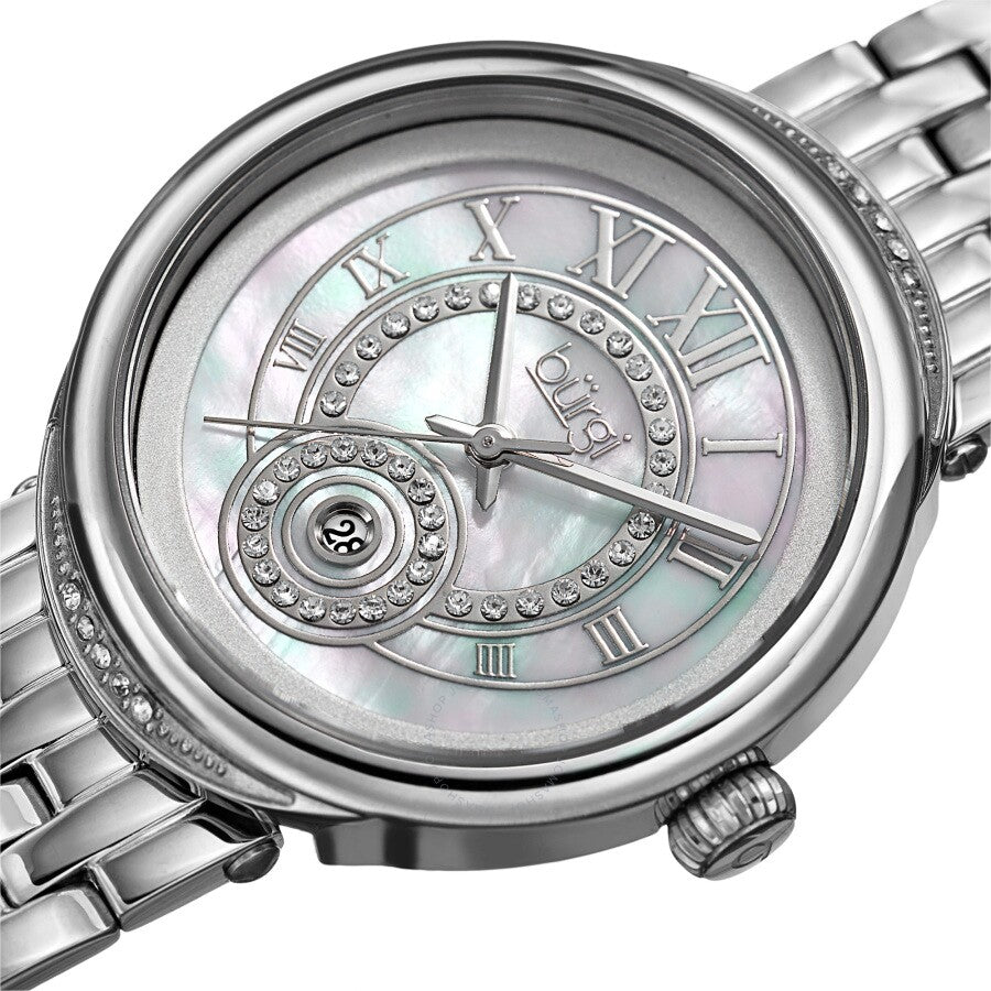 Stainless steel case with a stainless steel bracelet. Fixed stainless steel bezel set Swarovski crystals. Mother of pearl (crystal-set) dial with silver-tone hands and Roman numeral hour markers. Dial Type: Analog. Date display at the 6 o'clock position. Quartz movement. Scratch resistant mineral crystal. Pull / push crown. Solid case back. Round case shape. Case size: 34 mm. Case thickness: 8 mm. Band width: 19 mm. Band length: 7 inches. Deployment with push button release clasp. Water resistant at 30 meters / 100 feet. Functions: date, hour, minute, second. Bur164ss Series. Casual watch style. Burgi BUR164SS Mother of Pearl Dial Ladies Watch BUR164SS.