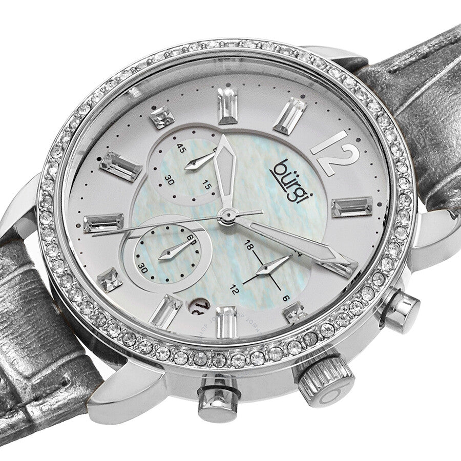 crystal chronograph grey leather mother of pearl dial ladies watch bur089gy