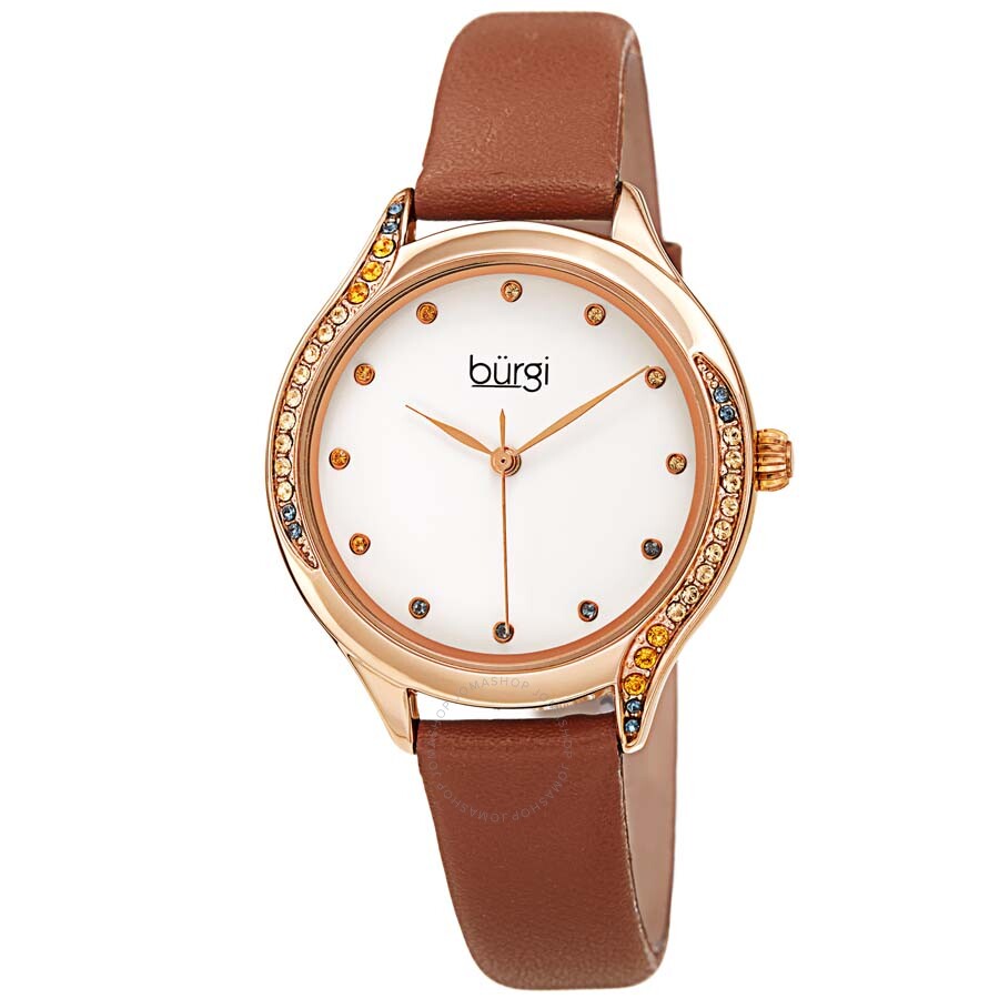 Rose gold-tone polished alloy case with a brown leather strap. Fixed rose gold-tone alloy bezel set with Swarovski crystals. White dial with rose gold-tone leaf hands and Swarovski crystal hour markers. Dial Type: Analog. Quartz movement. Scratch resistant mineral hardened coating crystal. Pull / push crown. Solid case back. Round case shape. Case size: 34 mm. Case thickness: 7.5 mm. Band width: 14 mm. Band length: 7.5 inches. Tang clasp. Water resistant at 30 meters / 100 feet. Functions: hour, minute, second. Crystal Series. Casual watch style. Burgi Crystal White Dial Brown Leather Ladies Watch BUR239BR.