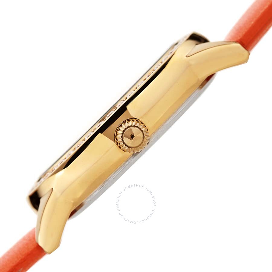 Gold-tone alloy case with a orange leather strap. Fixed gold-tone alloy set with diamonds bezel. White dial with gold-tone dauphine hands and index hour markers. Dial Type: Analog. Quartz movement. Scratch resistant mineral crystal with a hardened coating. Pull / push crown. Solid case back. Round case shape. Case size: 34 mm. Case thickness: 7.5 mm. Band width: 16 mm. Band length: 7 inches. Tang clasp. Water resistant at 30 meters / 100 feet. Functions: hour, minute, second. Diamond Series. Dress watch style. Burgi Diamond White Dial Ladies Watch BUR221OR.