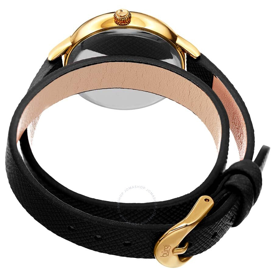 Yellow gold-tone polished alloy case with a black (safiano) leather (double wrap) strap. Fixed yellow gold-tone polished alloy bezel set with crystals. White mother of pearl dial with yellow gold-tone baton hands. A single diamond is set at the 12 o'clock position. Dial Type: Analog. Quartz movement. Scratch resistant mineral with hardened coating crystal. Pull / push crown. Solid case back. Round case shape. Case size: 32 mm. Case thickness: 8 mm. Band width: 10 mm. Band length: 7 inches. Tang clasp. Water resistant at 30 meters / 100 feet. Functions: hour, minute, second. Diamond Series. Casual watch style. Burgi Diamond White Mother of Pearl Dial Ladies Watch BUR224BK.