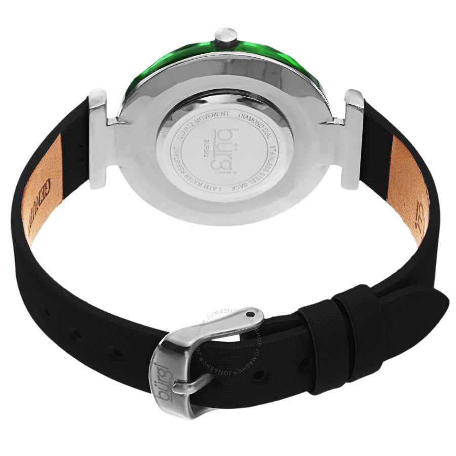 Silver-tone composite metal case with a black leather strap. Fixed silver-tone composite metal bezel with a green faceted crystal ring. Black dial with silver-tone dauphine-style shape hands. Asingle diamond is set at the 12 o'clock position. Dial Type: Analog. Quartz movement. Scratch resistant mineral crystal. Pull / push crown. Solid case back. Round case shape. Case size: 34 mm. Case thickness: 10.5 mm. Band width: 14 mm. Band length: 8.5 inches. Tang clasp. Water resistant at 30 meters / 100 feet. Functions: hour, minute, second. Faceted Crystal Bezel Series. Fashion watch style. Burgi Faceted Crystal Bezel Diamond Black Dial Ladies Watch BUR252GN.