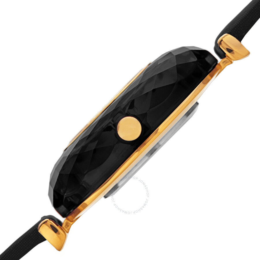 Gold-tone composite metal case with a black leather strap. Fixed black composite metal bezel with faceted crystal ring. Silver-tone dial with gold-tone dauphine-style hands. A single diamond is set at the 12 o'clock position. Dial Type: Analog. Quartz movement. Scratch resistant mineral crystal. Pull / push crown. Solid case back. Round case shape. Case size: 34 mm. Case thickness: 10.5 mm. Band width: 14 mm. Band length: 8.5 inches. Tang clasp. Water resistant at 30 meters / 100 feet. Functions: hour, minute. Faceted Crystal Bezel Series. Fashion watch style. Burgi Faceted Crystal Bezel Quartz Diamond Silver Dial Ladies Watch BUR252BK.