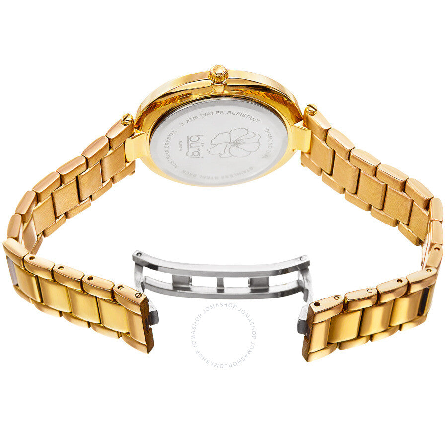 Yellow gold-tone composite metal case with a yellow gold-tone stainless steel bracellet set with Swarovski crystals. Fixed yellow gold-tone composite metal bezel set with Swarovski crystals. Gold (flower print) dial with luminous yellow gold-tone lance-style hands. Diamonds set at the 3, 6, 9 and 12 o'clock positions. Dial Type: Analog. Luminescent hands. Quartz movement. Scratch resistant mineral crystal. Pull / push crown. Solid case back. Round case shape. Case size: 36 mm. Case thickness: 8.7 mm. Band width: 16 mm. Band length: 6.5 inches. Butterfly clasp. Water resistant at 30 meters / 100 feet. Functions: hour, minute, second. Flower Marker Series. Fashion watch style. Burgi Flower Marker Diamond Crystal Ladies Watch BUR179YG.