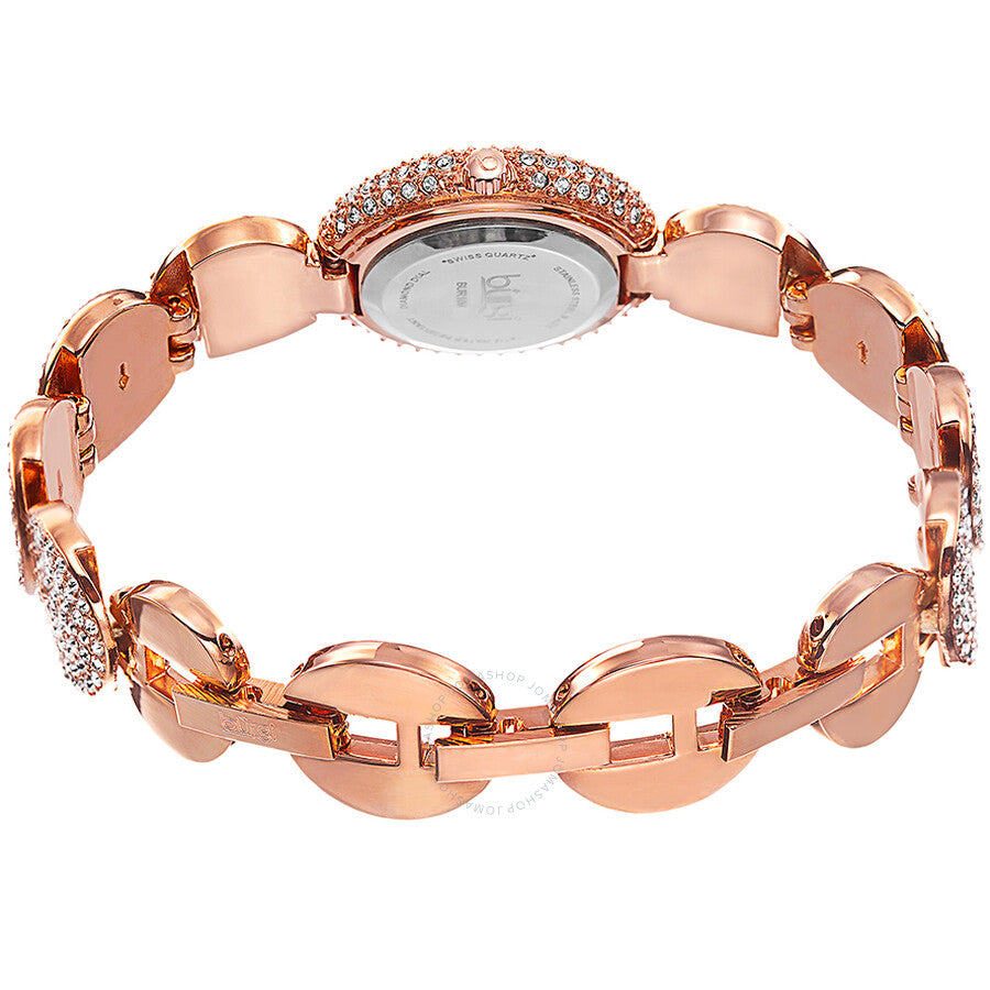 Rose gold-tone brass case set (all over) with crystals with a rose gold-tone brass crystal pave bracelet. Fixed rose gold-tone crystal pave bezel. Mother of pearl dial with rose gold-tone hands. Diamonds mark the 6 and 12 o'clock positions. Dial Type: Analog. Quartz movement. Scratch resistant mineral crystal. Pull / push crown. Screw down case back. Case diameter: 29.5 mm. Case thickness: 9 mm. Round case shape. Band width: 16 mm. Band length: 7.5 inches. Jewellery clasp. Water resistant at 10 meters / 33 feet. Functions: hour, minute, second. Casual watch style. Watch label: Hong Kong. Burgi Mother of Pearl Diamond Dial Silver-tone Base Metal Ladies Watch BUR109RG.