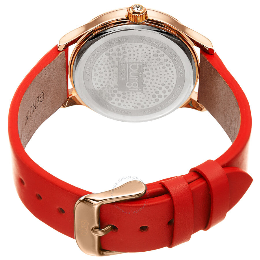 Gold-tone composite metal case with a red leather strap. Fixed gold-tone composite metal bezel. White (fan pattern) (Swarovski crystal-set) dial with black leaf-style hands. No markers. Dial Type: Analog. Quartz movement. Scratch resistant mineral crystal. Pull / push crown. Solid case back. Round case shape. Case size: 36 mm. Case thickness: 10.3 mm. Band width: 18 mm. Band length: 7.5 inches. Tang clasp. Water resistant at 30 meters / 100 feet. Functions: hour, minute. Pebble Style Series. Fashion watch style. Burgi Pebble Style Quartz White Dial Ladies Watch BUR238RD.