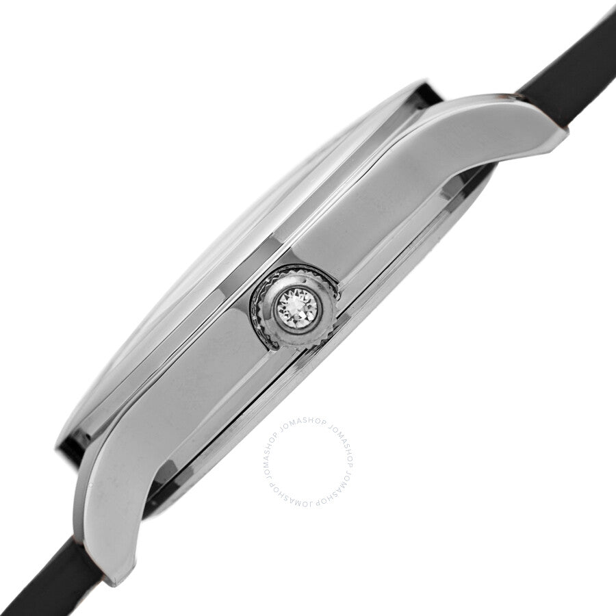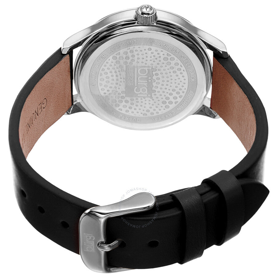Silver-tone composite metal case with a black leather strap. Fixed silver-tone composite metal bezel. White (fan pattern) (Swarovski crystal-set) dial with black leaf-style hands. No markers. Dial Type: Analog. Quartz movement. Scratch resistant mineral crystal. Pull / push crown. Solid case back. Round case shape. Case size: 36 mm. Case thickness: 10.3 mm. Band width: 18 mm. Band length: 7.5 inches. Tang clasp. Water resistant at 30 meters / 100 feet. Functions: hour, minute. Pebble Style Series. Fashion watch style. Burgi Pebble Style Quartz White Dial Ladies Watch BUR238SSB.