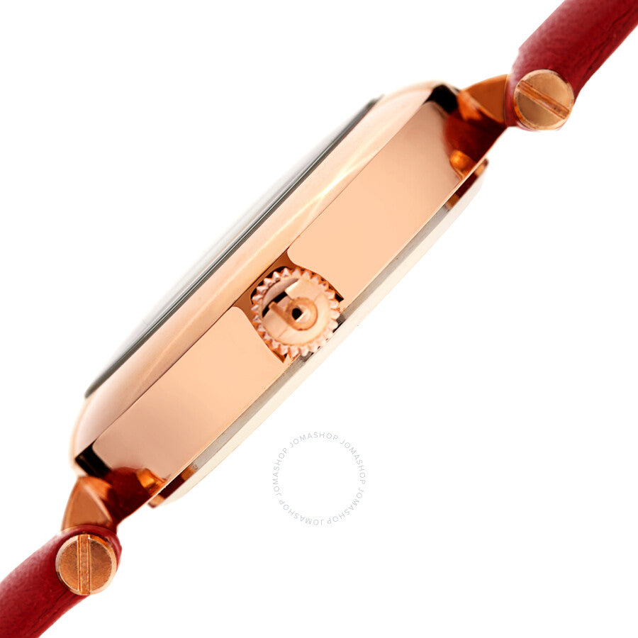 Rose gold-tone composite metal case with a red leather strap. Fixed rose gold-tone composite metal bezel. Red dial with luminous rose gold-tone hands. Diamonds appear at the 3, 6, 9 and 12 o'clock positions. Dial Type: Analog. Luminescent hands. Quartz movement. Scratch resistant mineral crystal. Pull / push crown. Solid case back. Round case shape. Case size: 32 mm. Case thickness: 9 mm. Band width: 14 mm. Band length: 7 inches. Tang clasp. Water resistant at 30 meters / 100 feet. Functions: hour, minute. Fashion watch style. Burgi Quartz Diamond Red Dial Red Leather Ladies Watch BUR196RD.