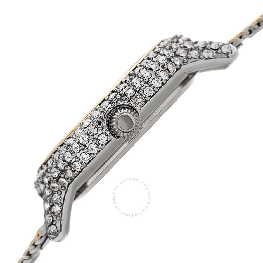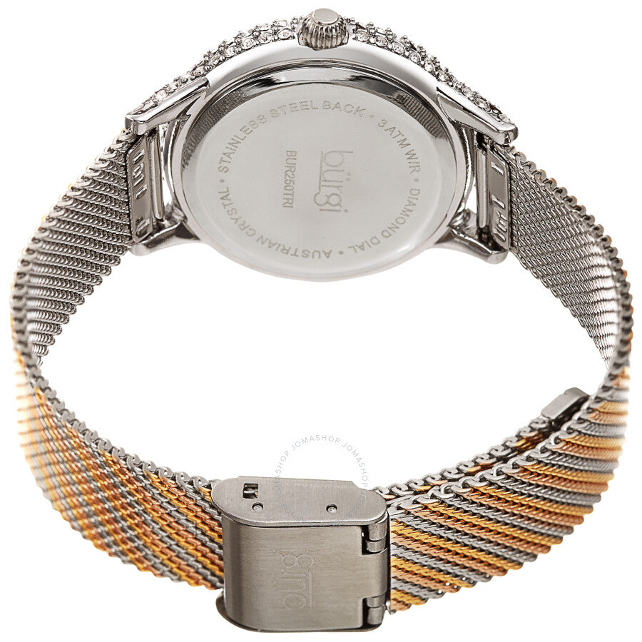 Silver-tone alloy case set (all over) with Swarovski crystals with a two-tone (silver-tone and gold-tone) stainless steel mesh bracelet. Fixed gold-tone alloy bezel set with Swarovski crystal. Silver dial with gold-tone leaf-style hands. Diamonds mark the 3, 6, 9 and 12 o'clock positions. Dial Type: Analog. Quartz movement. Scratch resistant mineral crystal. Pull / push crown. Solid case back. Round case shape. Case size: 34 mm. Case thickness: 7 mm. Band width: 14 mm. Band length: 8.5 inches. Fold over slip through clasp. Water resistant at 30 meters / 100 feet. Functions: hour, minute, second. Fashion watch style. Burgi Quartz Diamond Silver Dial Ladies Watch BUR250TRI.