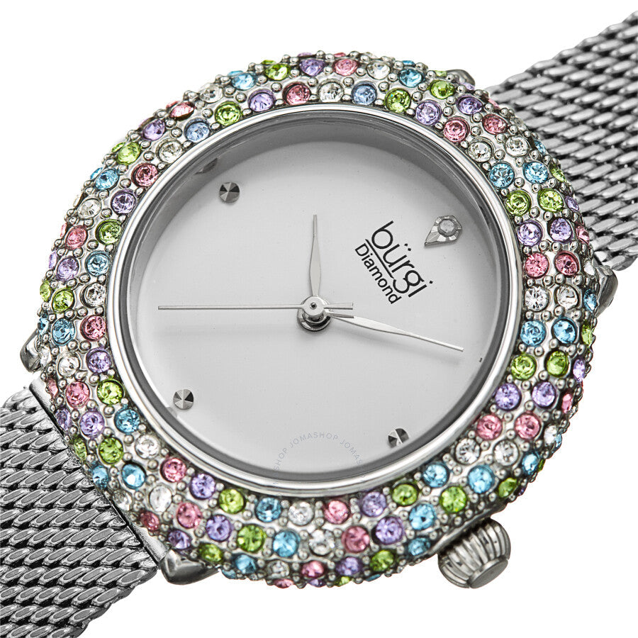 Silver-tone brass case with a stainless steel mesh bracelet. Fixed silver-tone brass bezel set with multi-coloured Swarovski crystals. Silver dial with silver-tone hands. A single diamond is set at the 12 o'clock position. Dots mark the 3, 6 and 9 o'clock positions. Dial Type: Analog. Quartz movement. Scratch resistant Hardlex crystal. Pull / push crown. Solid case back. Round case shape. Case size: 33 mm. Case thickness: 7.5 mm. Band width: 14 mm. Band length: 8 inches. Fold over slip through clasp. Water resistant at 30 meters / 100 feet. Functions: hour, minute, second. Fashion watch style. Burgi Quartz Diamond Silver Dial Ladies Watch BUR258SS.
