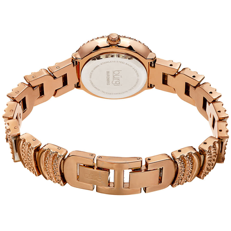 Rose gold-tone brass case with a rose gold-tone stainless steel bracelet set with crystals. Fixed rose gold-tone brass bezel set with crystals. White dial with rose gold-tone hands. Diamonds mark the 3, 6, 9 and 12 o'clock positions. Dial Type: Analog. Quartz movement. Scratch resistant Hardlex crystal. Pull / push crown. Solid case back. Round case shape. Case size: 33 mm. Case thickness: 7.5 mm. Band width: 14 mm. Jewellery clasp. Water resistant at 30 meters / 100 feet. Functions: hour, minute, second. Dress watch style. Burgi Quartz Diamond White Dial Ladies Watch BUR266RG.
