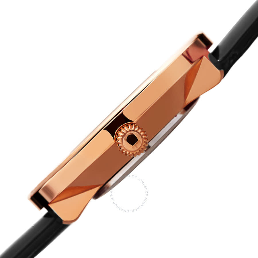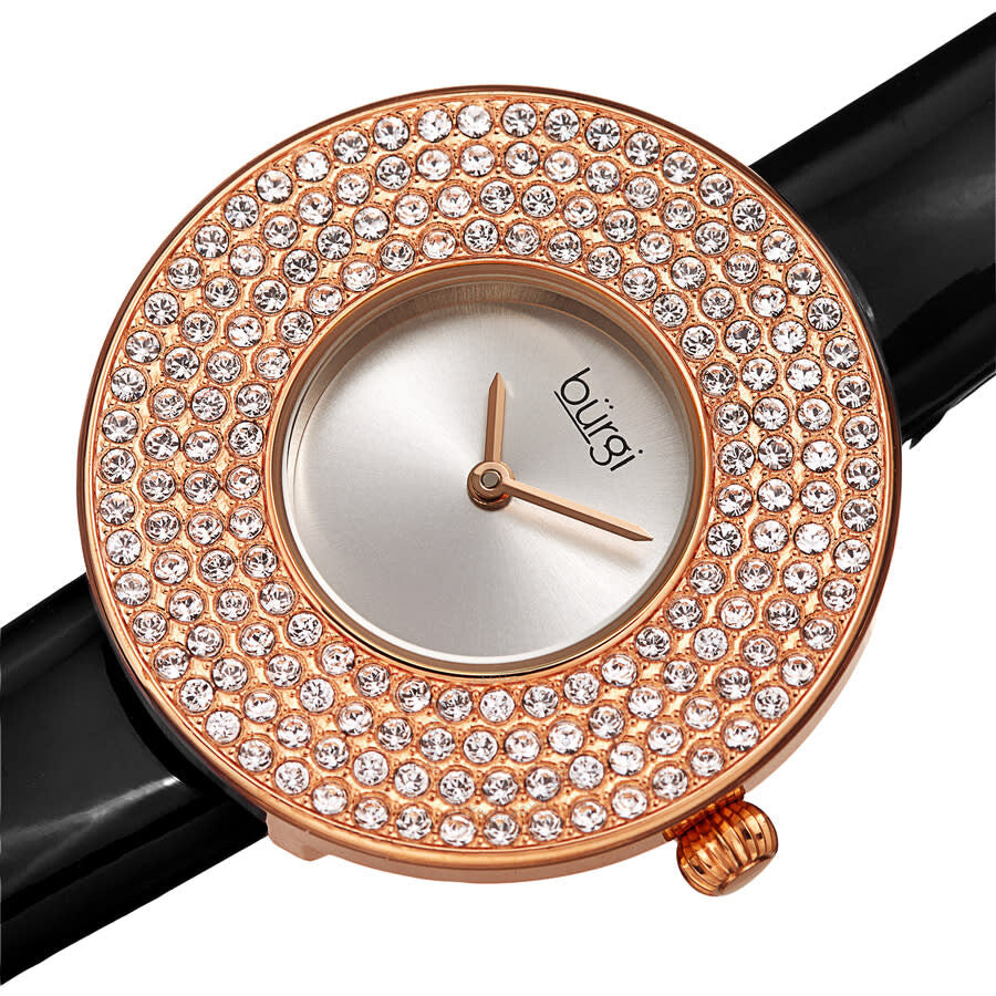 Rose gold-tone brass case with a black leather strap. Fixed rose gold-tone brass bezel set with Swarovski crystals. Silver dial with rose gold-tone hands. No markers. Dial Type: Analog. Quartz movement. Scratch resistant Hardlex crystal. Pull / push crown. Solid case back. Round case shape. Case size: 36 mm. Case thickness: 8 mm. Band width: 14 mm. Tang clasp. Water resistant at 30 meters / 100 feet. Functions: hour, minute. Dress watch style. Burgi Quartz Silver Dial Black Leather Ladies Watch BUR272RGB.