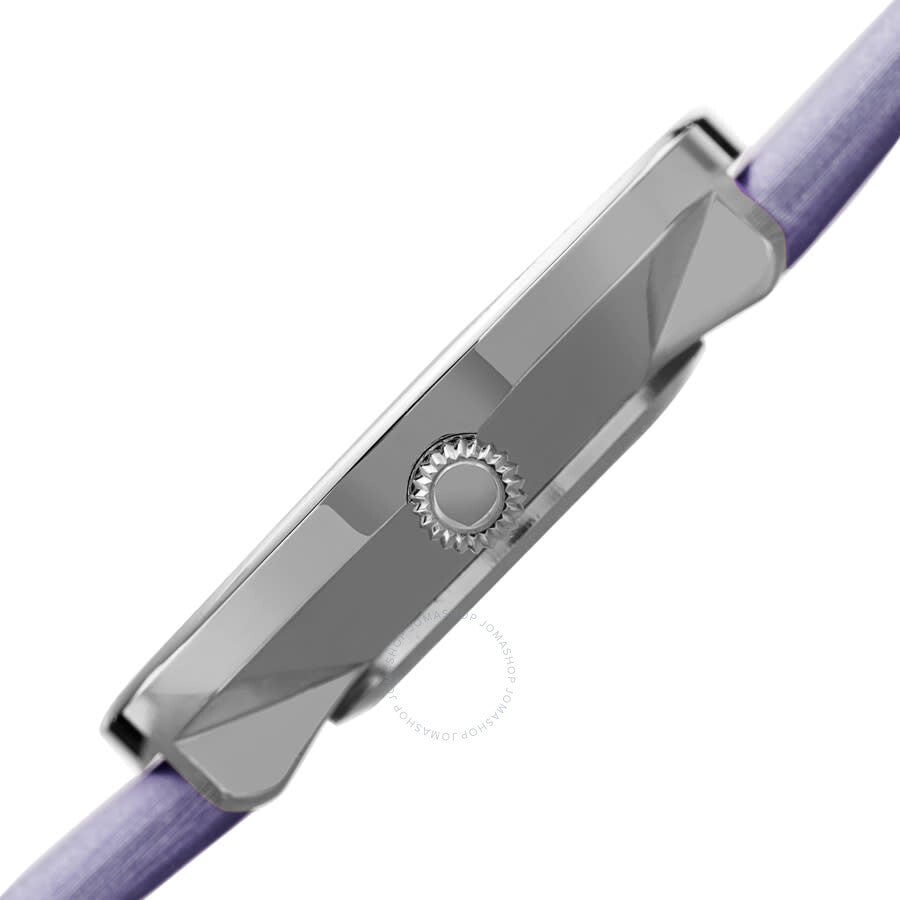 Silver-tone brass case with a purple satin (leather backed) strap. Fixed silver-tone brass set with swarovski crystals bezel. Silver dial with silver-tone hands. No markers. Dial Type: Analog. Quartz movement. Scratch resistant Hardlex crystal. Pull / push crown. Solid case back. Round case shape. Case size: 36 mm. Case thickness: 8 mm. Band width: 14 mm. Tang clasp. Water resistant at 30 meters / 100 feet. Functions: hour, minute. Dress watch style. Burgi Quartz Silver Dial Ladies Watch BUR270SSP.