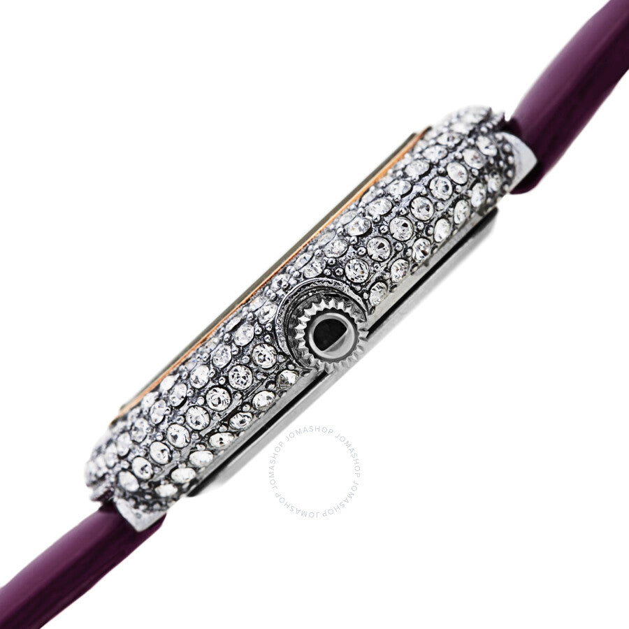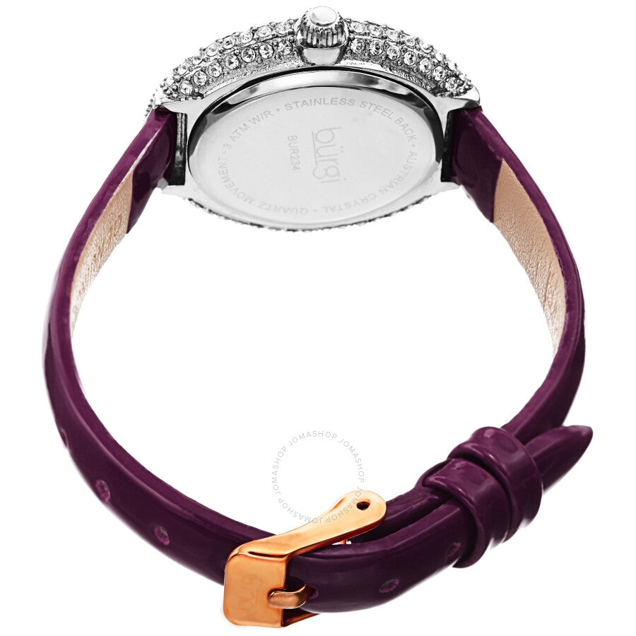 Rose gold-tone brass set (all over) with Swarovski crystals with a purple leather strap. Fixed rose gold-tone brass bezel set with Swarovski crystals. White dial with rose gold-tone hands and swarovski crystal hour markers. Minute markers around the outer rim. Dial Type: Analog. Quartz movement. Scratch resistant mineral crystal. Pull / push crown. Solid case back. Round case shape. Case size: 28 mm. Case thickness: 7.6 mm. Band width: 10 mm. Band length: 7.5 inches. Tang clasp. Water resistant at 30 meters / 100 feet. Functions: hour, minute, second. Fashion watch style. Burgi Quartz White Dial Ladies Watch BUR234PU.