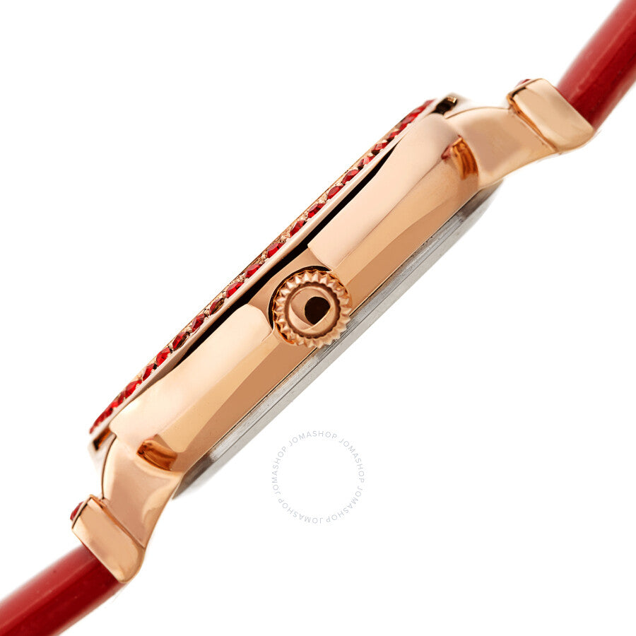 Yellow gold-tone composite metal case with a red leather strap. Red crystal-set lugs. Fixed yellow gold-tone composite metal bezel set with red crystals. White dial with yellow gold-tone dauphine-style hands and index hour markers. Dial Type: Analog. Quartz movement. Scratch resistant mineral crystal. Pull / push crown. Solid case back. Round case shape. Case size: 31 mm. Case thickness: 8 mm. Band width: 14 mm. Band length: 7.25 inches. Tang clasp. Water resistant at 30 meters / 100 feet. Functions: hour, minute, second. Fashion watch style. Burgi Quartz White Dial Ladies Watch BUR243RD.