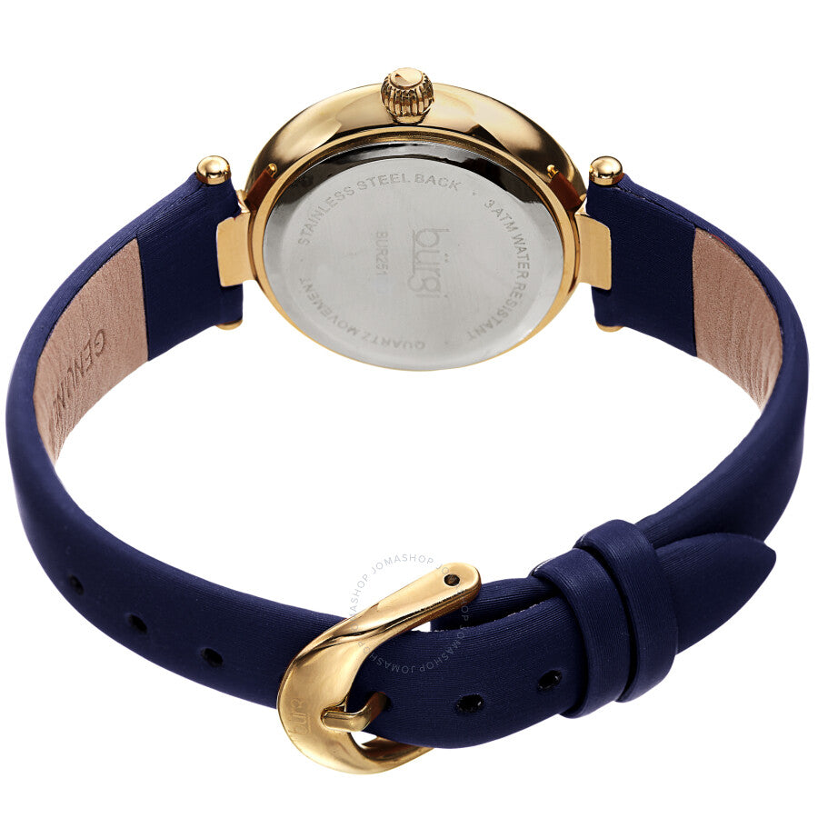 Rose gold-tone composite case with a blue leather strap. Fixed rose gold-tone bezel set with with ombra crystals. White dial with gold-tone leaf-style hands and crystal hour markers. Arabic Numerals appear at the 3, 6, 9 and 12 o'clock positions. Dial Type: Analog. Quartz movement. Scratch resistant mineral crystal. Pull / push crown. Solid case back. Round case shape. Case size: 31 mm. Case thickness: 7.5 mm. Band width: 14 mm. Band length: 7.5 inches. Tang clasp. Water resistant at 30 meters / 100 feet. Functions: hour, minute, second. Fashion watch style. Burgi Quartz White Dial Ladies Watch BUR251BU.