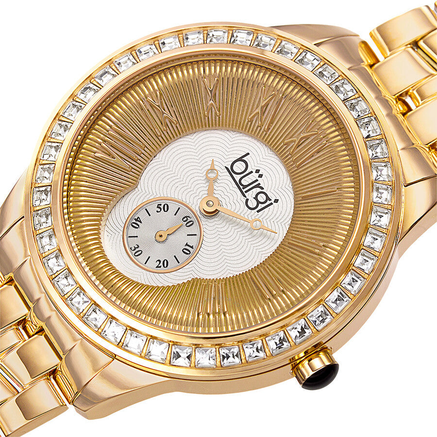 Gold-tone stainless steel case and bracelet. Fixed gold-tone bezel set with baguette Swarovski crystalsl. Gold and silver dial with gold-tone hands and Roman numeral hour markers. Dial Type: Analog. Small seconds above the 6 o'clock positions subdials. Quartz movement. Scratch resistant mineral crystal. Pull / push crown. Screw down case back. Round case shape. Case size: 38 mm. Case thickness: 9 mm. Band width: 18 mm. Band length: 7.5 inches. Jewellery clasp. Water resistant at 30 meters / 100 feet. Functions: hour, minute, second. Casual watch style. Watch label: Hong Kong. Burgi Silver and Gold Dial Gold-tone Steel Ladies Watch BUR106YG.