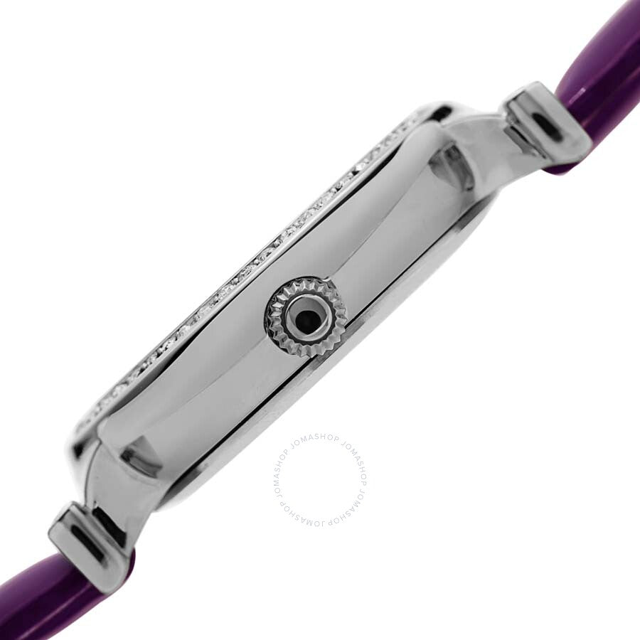 Silver-tone alloy case with a purple (patent) leather strap. Fixed silver-tone alloy bezel set with Swarovski crystals. Silver dial with silver-tone dauphine hands and index hour markers. Dial Type: Analog. Quartz movement. Scratch resistant mineral crystal. Pull / push crown. Solid case back. Round case shape. Case size: 31 mm. Case thickness: 8 mm. Band width: 14 mm. Band length: 7.25 inches. Tang clasp. Water resistant at 30 meters / 100 feet. Functions: hour, minute, second. Swarovski Crystals Series. Casual watch style. Burgi Swarovski Crystals Quartz Silver Dial Ladies Watch BUR230PU.