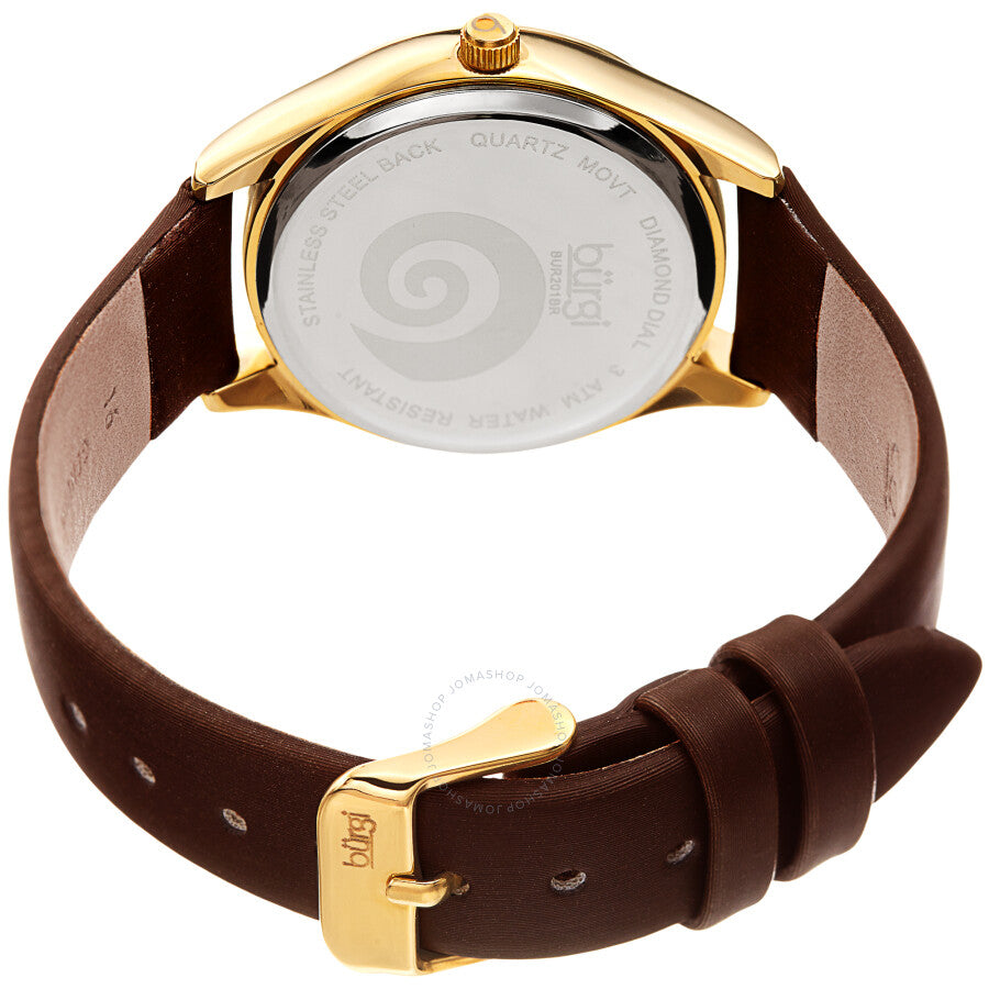Yellow gold-tone composite metal case with a brown (satin over) leather strap. Fixed yellow gold-tone composite metal bezel. Brown (crystal powder swirl) dial with luminous yellow gold-tone leaf-style hands. Diamonds mark the 3, 9 and 12 o'clock positions. Dial Type: Analog. Luminescent hands. Quartz movement. Scratch resistant mineral crystal. Pull / push crown. Solid case back. Round case shape. Case size: 34 mm. Case thickness: 10 mm. Band width: 16 mm. Band length: 7 inches. Tang clasp. Water resistant at 30 meters / 100 feet. Functions: hour, minute. Swirl Series. Fashion watch style. Burgi Swirl Quartz Diamond Brown Dial Ladies Watch BUR201BR.
