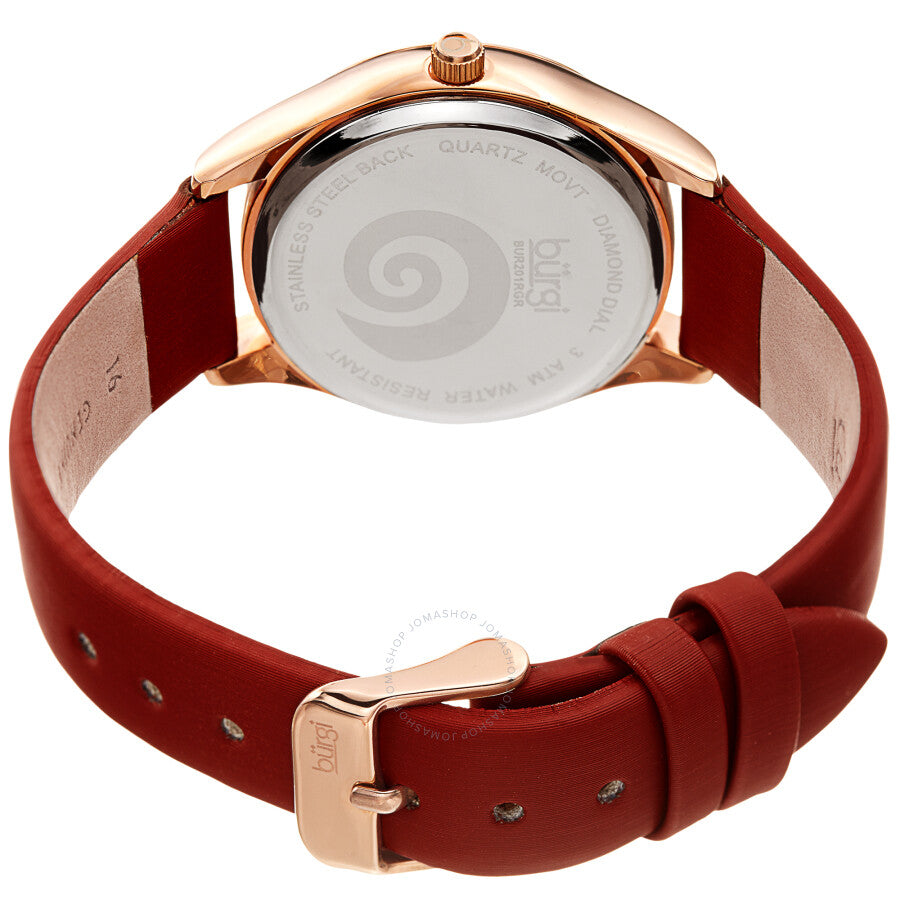 Rose gold-tone composite metal case with a red leather strap. Fixed rose gold-tone composite metal bezel. Red (crystal powder swirl) dial with luminous rose gold-tone leaf-style hands. Diamonds set at the 3, 9 and 12 o'clock positions. Dial Type: Analog. Luminescent hands. Quartz movement. Scratch resistant mineral crystal. Pull / push crown. Solid case back. Round case shape. Case size: 34 mm. Case thickness: 10 mm. Band width: 16 mm. Band length: 7 inches. Tang clasp. Water resistant at 30 meters / 100 feet. Functions: hour, minute. Swirl Series. Fashion watch style. Burgi Swirl Quartz Diamond Red Dial Ladies Watch BUR201RGR.