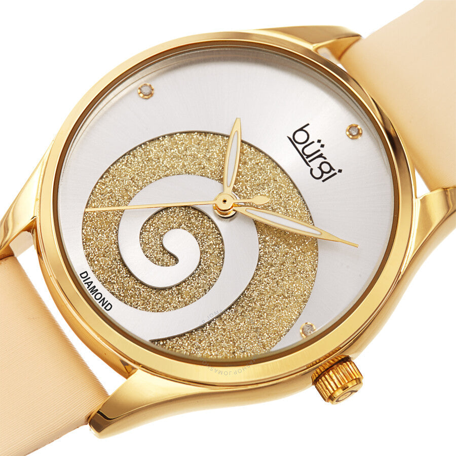 Yellow gold-tone composite metal case with a gold leather strap. Fixed yellow gold-tone composite metal bezel. Silver (crystal powder swirl) dial with luminous yellow gold-tone leaf-style hands. Diamonds mark the 3, 9 and 12 o'clock positions. Dial Type: Analog. Luminescent hands. Quartz movement. Scratch resistant mineral crystal. Pull / push crown. Solid case back. Round case shape. Case size: 34 mm. Case thickness: 10 mm. Band width: 16 mm. Band length: 7 inches. Tang clasp. Water resistant at 30 meters / 100 feet. Functions: hour, minute. Swirl Series. Fashion watch style. Burgi Swirl Quartz Diamond Silver Dial Ladies Watch BUR201YG.