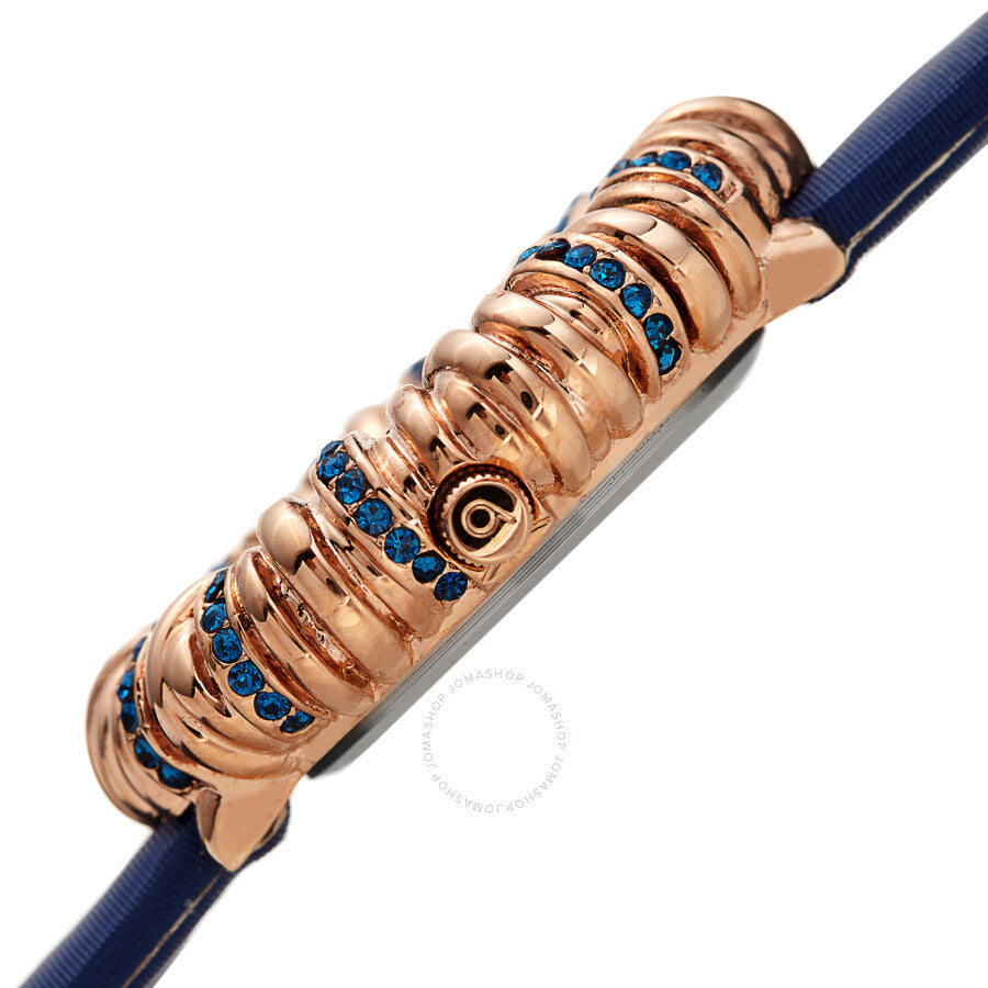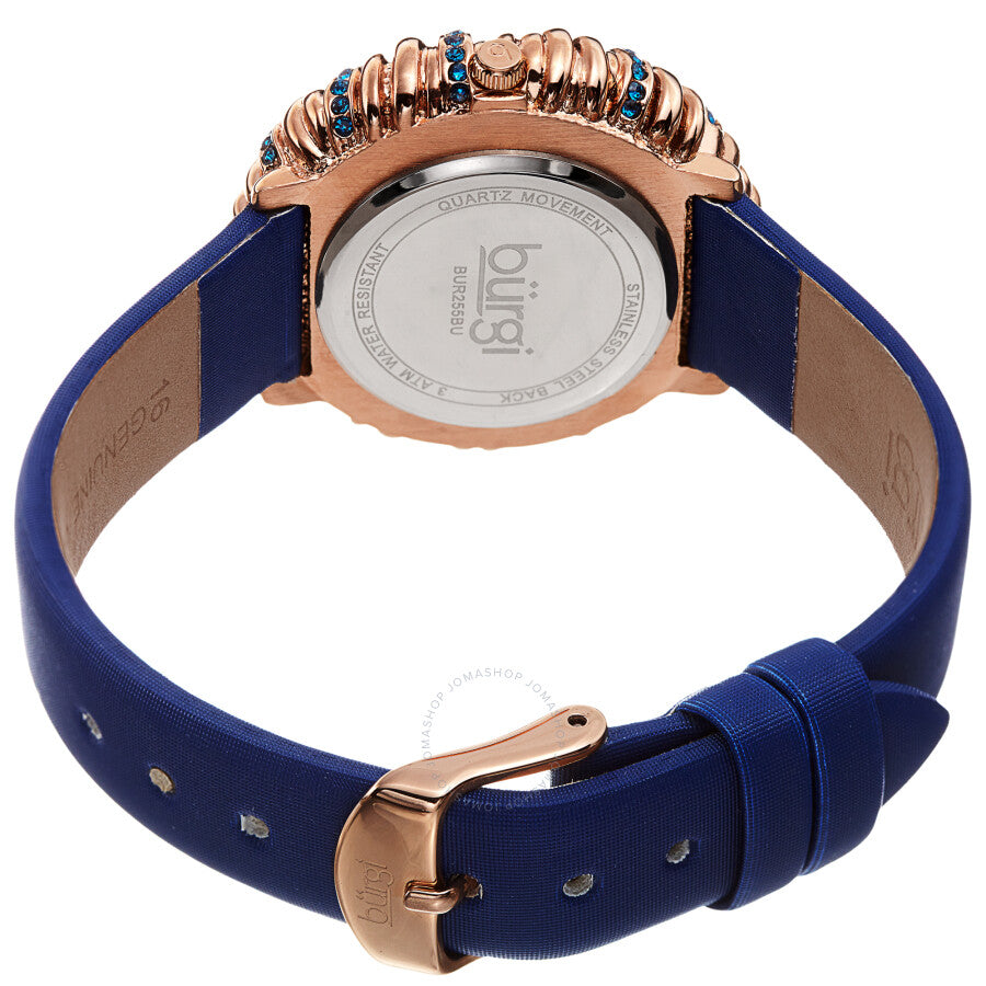 Gold-tone brass case with a blue leather strap. Fixed twisted gold-tone brass bezel with with multiple loops and set with vibrant coloured Czech crystals. White mother of pearl dial with gold-tone dauphine-style hands. No markers. Dial Type: Analog. Quartz movement. Scratch resistant mineral crystal. Pull / push crown. Solid case back. Round case shape. Case size: 38 mm. Case thickness: 10 mm. Band width: 16 mm, band length: 8.5 inches. Tang clasp. Water resistant at 30 meters / 100 feet. Functions: hour, minute. Twisted Bezel Series. Fashion watch style. Burgi Twisted Bezel Quartz Crystal White Dial Ladies Watch BUR255BU.