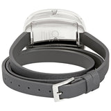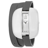 Stainless steel case with a grey cloth (leather backed) strap. Fixed stainless steel bezel with off white acetate insert. Silver dial with silver-tone hands. No markers. Dial Type: Analog. Quartz movement. Scratch resistant mineral crystal. Pull / push crown. Solid case back. Rectangle case shape. Case size: 35 mm. Case thickness: 9 mm. Band width: 9 mm. Band length: 6.5 inches. Tang clasp. Water resistant at 30 meters / 100 feet. Functions: hour, minute. Casual watch style. Watch label: Swiss Made. Calvin Klein Treasure Silver Dial Ladies Watch K2E23620.