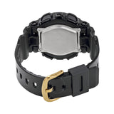 Black resin case with a black resin strap. Fixed black resin bezel. Gold/black dial with gold-tone hands and index hour markers. Minute markers around the outer rim. Dial Type: Analog-digital. Quartz movement. Scratch resistant mineral crystal. Solid case back. Case dimensions: 46.3 mm x 43.4 mm. Case thickness: 15.8 mm. Round case shape. Tang clasp. Water resistant at 100 meters / 330 feet. Functions: hour, minute, second, world time, 5 daily alarms, stopwatch, countdown timer, full auto calendar, 12/24 hour. Sport watch style. Casio Baby G Black Resin Ladies Watch BA110-1A.