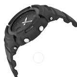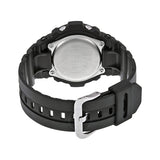 Black resin case with a black resin strap. Fixed black resin bezel. Black dial with silver-tone hands and index hour markers. Minute markers around the outer rim. Dial Type: Analog-digital. Luminescent hands and markers. Three digital sub-dials displaying: date, day of week and seconds. Quartz movement. Scratch resistant mineral crystal. Solid case back. Case diameter: 46.4 mm. Case thickness: 14.9 mm. Round case shape. Band width: 16 mm. Tang clasp. Water resistant at 200 meters / 660 feet. Additional Info: World time 31 times zones (48 cities + UTC) city code display daylight saving on/off 5 daily alarms hourly time signal 1/100 second stopwatch measurin. Sport watch style. Casio G-Shock Tough Solar Power Atomic Men's Watch AWGM100B-1A.