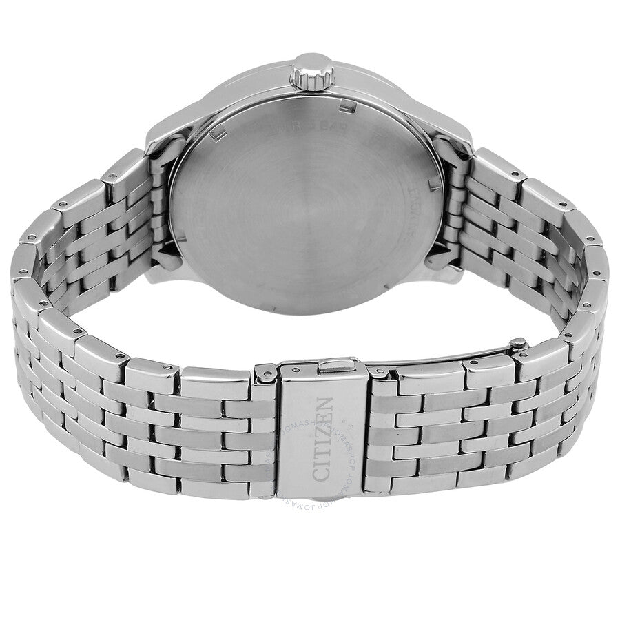 Silver-tone stainless steel case and bracelet. Fixed stainless steel bezel. Blue dial with luminous silver-tone hands and alternating index and Roman numerals hour markers. Minute markers around the outer rim. Dial Type: Analog. Luminescent hands. Day of the week and date display at the 3 o'clock position. Citizen caliber 8200 automatic movement. Scratch resistant mineral crystal. Pull / push crown. Solid case back. Round case shape. Case size: 40 mm. Case thickness: 11 mm. Band width: 20 mm. Fold over clasp. Water resistant at 50 meters / 165 feet. Functions: date, day, hour, minute, second. Casual watch style. Citizen Automatic Blue Dial Men's Watch NH8350-59L.