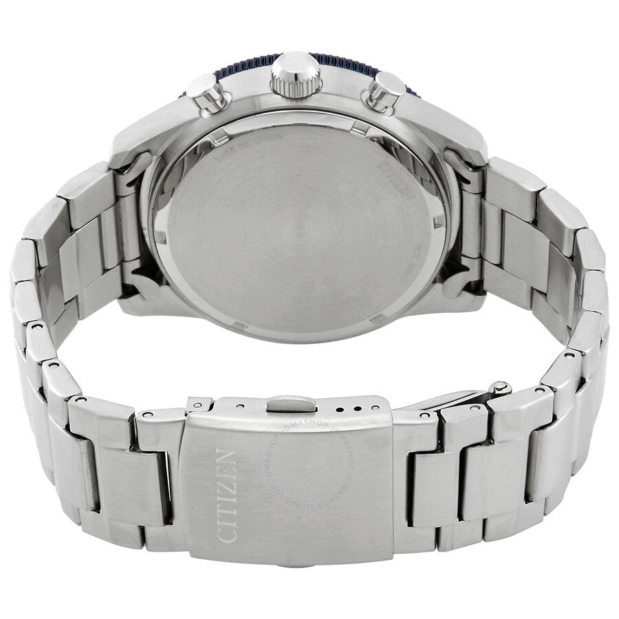 Silver-tone stainless steel case and bracelet. Blue stainless steel bezel. Blue dial with silver-tone hands and index-Arabic numeral hour markers. Minute markers around the outer rim. Dial Type: Analog. Luminescent hands and markers. Date display between 4 and 5 o'clock position. Chronograph - three sub-dials displaying: 60 second, 60 minute and 24 hour. Citizen Caliber Eco-Drive B620 eco-drive movement. Scratch resistant mineral crystal. Solid case back. Round case shape, case size: 43 mm, case thickness: 12.9 mm. Fold over clasp with a safety release. Water resistant at 100 meters / 330 feet. Functions: chronograph, date, hour, minute, second, solar-powered. Sport watch style. Watch label: Japan Movt. Citizen Chronograph Eco-Drive Blue Dial Men's Watch CA4554-84L.