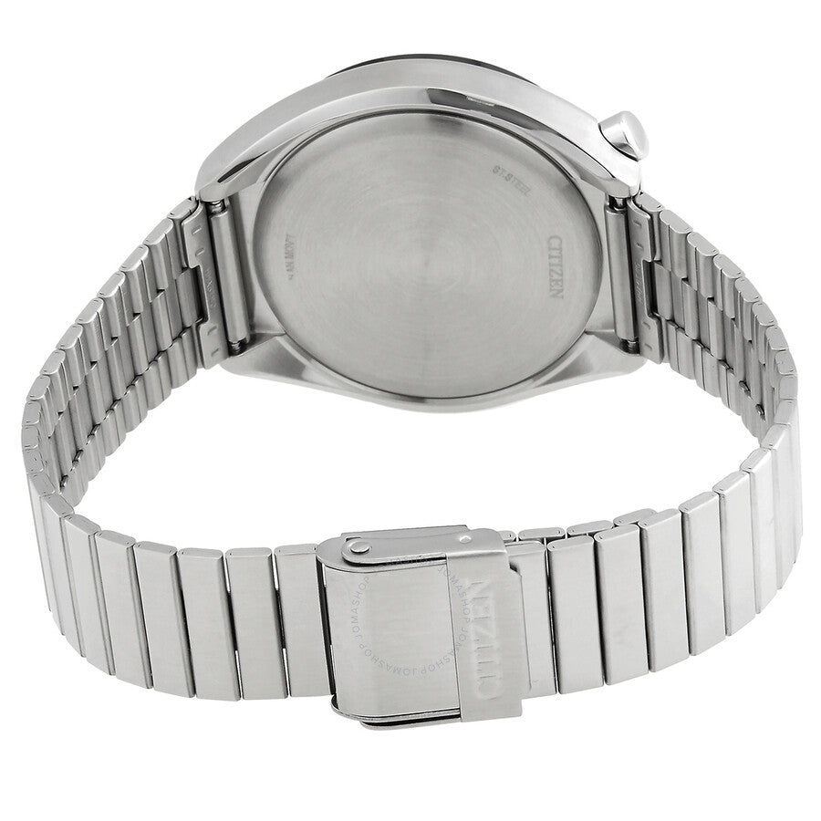 Silver-tone stainless steel case and bracelet. Fixed black stainless steel bezel. Black dial with silver-tone hands and index hour markers. Arabic numeral minute markers (at 5 minute intervals). Dial Type: Analog. Luminescent hands and markers. Date display between 4 and 5 o'clock position. Chronograph - three sub-dials displaying: 60 second, 60 minute and 12 hour. Quartz movement. Scratch resistant mineral crystal. Pull / push crown. Solid case back. Round case shape, case size: 38 mm, case thickness: 11.7 mm. Deployment with push button release clasp. Water resistant at 50 meters / 165 feet. Functions: chronograph, date, hour, minute, second. Dress watch style. Watch label: Japan Movt. Citizen Chronograph Quartz Black Dial Men's Watch AN3660-81E.