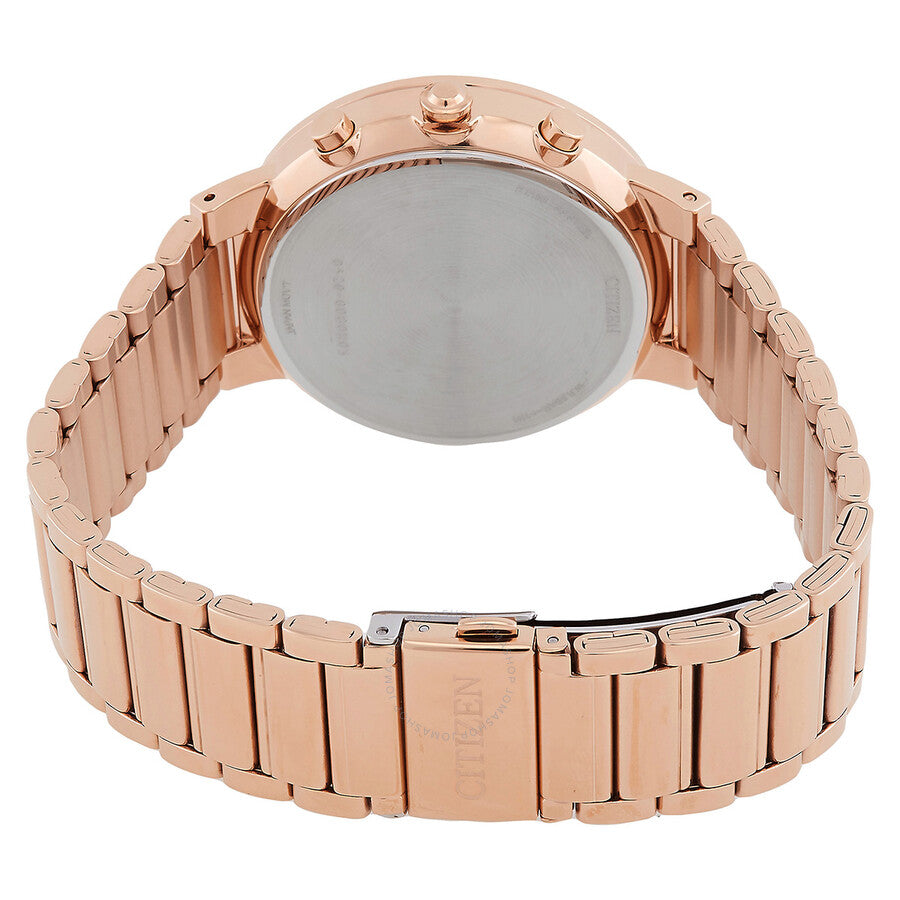 Rose gold IP stainless steel case and bracelet. Fixed rose gold IP stainless steel bezel. Green dial with rose gold-tone hands and index hour markers. Minute markers around the outer rim. Dial Type: Analog. Date display between 4 and 5 o'clock position. Chronograph - three sub-dials displaying: 60 second, 60 minute and 24 hour. Citizen Caliber 0520 quartz movement. Scratch resistant mineral crystal. Solid case back. Round case shape, case size: 42 mm. Fold over clasp with a safety release. Water resistant at 50 meters / 165 feet. Functions: chronograph, date, hour, minute, second. Sport watch style. Watch label: Japan Movt. Citizen Chronograph Quartz Green Dial Men's Watch AN8223-54X.
