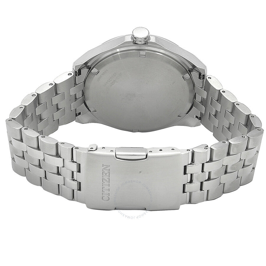 Silver-tone stainless steel case and bracelet. Fixed silver-tone stainless steel bezel. Blue dial with silver-tone hands and index-Arabic numeral hour markers. Arabic numeral marker appears at the 6 and 12 o'clock positions. Minute markers around the inner rim. Dial Type: Analog. Date display at the 3 o'clock position. Citizen Caliber Eco-Drive J810 eco-drive movement. Scratch resistant mineral crystal. Solid case back. Round case shape, case size: 42 mm. Band width: 22 mm. Fold over clasp with a safety release. Water resistant at 100 meters / 330 feet. Functions: date, hour, minute, second. Corso Series. Sport watch style. Watch label: Japan Movt. Citizen Corso Eco-Drive Blue Dial Men's Watch AW1740-54L.