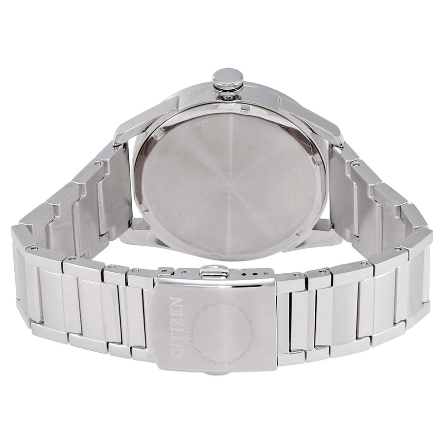 Stainless steel case with a stainless steel bracelet. Fixed stainless steel bezel. Blue dial with silver-tone hands and index hour markers. ARoman numeral appears at the 12 o'clock position. Minute markers around the outer rim. Dial Type: Analog. Day of the week and date display at the 3 o'clock position. Citizen caliber Eco-Drive J800 eco-drive movement. Scratch resistant mineral crystal. Pull / push crown. Solid case back. Round case shape. Case size: 42 mm. Band width: 22 mm. Fold over clasp. Water resistant at 100 meters / 330 feet. Functions: date, day, hour, minute, second, solar-powered. Classic Series. Casual watch style. Watch label: Japan Movt. Citizen Eco-Drive Classic Blue Dial Men's Watch AW0081-54L.