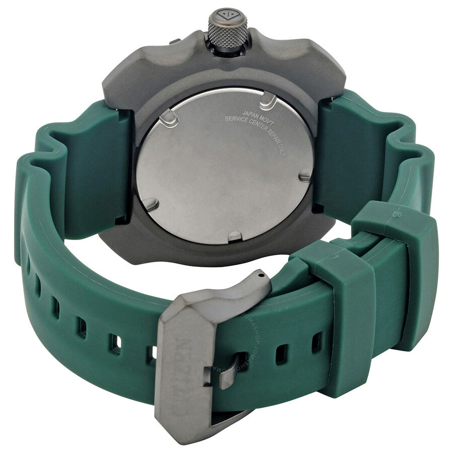 Gray super titanium case with a green polyurethane strap. Uni-directional rotating black bezel. Green dial with black hands and index hour markers. Minute markers around the outer rim. Dial Type: Analog. Luminescent hands and markers. Date display at the 3 o'clock position. Citizen Caliber Eco-Drive E168 eco-drive movement. Scratch resistant mineral crystal. Screw down crown. Solid case back. Round case shape, case size: 47 mm. Tang clasp. Water resistant at 200 meters / 660 feet. Functions: date, hour, minute, second, solar-powered. Promaster Diver Series. Dive watch style. Watch label: Japan Movt. Citizen Eco-Drive Promaster Diver Green Dial Super Titanium Men's Watch BN0228-06W.