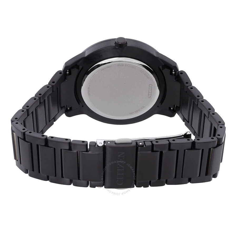 Black IP stainless steel case and bracelet. Fixed black IP stainless steel bezel. Blue dial with rose gold-tone hands and index hour markers. Minute markers around the outer rim. Dial Type: Analog. Date display at the 3 o'clock position. Citizen Caliber Eco-Drive E111 eco-drive movement. Scratch resistant sapphire crystal. Solid case back. Round case shape, case size: 39.2 mm, case thickness: 9.5 mm. Deployment with push button release clasp. Water resistant at 50 meters / 165 feet. Functions: date, hour, minute, second, solar-powered. Pair Series. Casual watch style. Watch label: Japan Movt. Citizen Pair Eco-Drive Blue Dial Men's Watch BM7595-89L.
