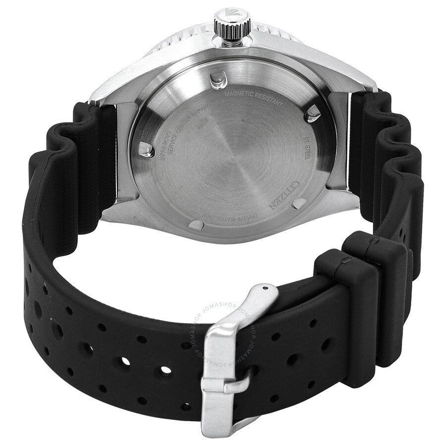 Silver-tone stainless steel case with a black rubber strap. Uni-directional rotating silver-tone stainless steel bezel with an inlaid black top ring. Smoky yellow dial with silver-tone hands and index hour markers. Minute markers around the outer rim. Dial Type: Analog. Luminescent hands and markers. Day of the week and date display at the 3 o'clock position. Citizen Caliber 8204 automatic movement. Scratch resistant mineral crystal. Screw down crown. Solid case back. Round case shape, case size: 41 mm, case thickness: 13.7 mm. Tang clasp. Water resistant at 200 meters / 660 feet. Functions: date, day, hour, minute, second. Promaster Diver Series. Dive watch style. Watch label: Japan Movt. Citizen Promaster Diver Automatic Yellow Dial Men's Watch NY0120-01X.