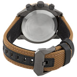 Black stainless steel case with a khaki nylon strap. Bi-directional rotating rose gold-tone stainless steel bezel. Green dial with gold-tone hands and index-Arabic numeral hour markers. Minute markers. Slide rule markings around the outer rim. Dial Type: Analog-digital. Luminescent hands and markers. Perpetual calendar. Chronograph - four sub-dials displaying: charge indicator, dual time, 24 hour, functions. Citizen Caliber Eco-Drive U680 eco-drive movement. Scratch resistant sapphire crystal. Screw down crown. Solid case back. Round case shape, case size: 46 mm, case thickness: 13.9 mm. Band width: 22 mm. Tang clasp. Water resistant at 200 meters / 660 feet. Functions: perpetual calendar, chronograph, world time, alarm, GMT, second time zone, hour, minute, second, power reserve indicator, solar-powered. Promaster Skyhawk Series. Sport watch style. Watch label: Japan Movt. Citizen Promaster Skyhawk Perpetual Alarm World Time Chronograph GMT Analog-Digital Green Dial Men's Watch JY8074-11X.