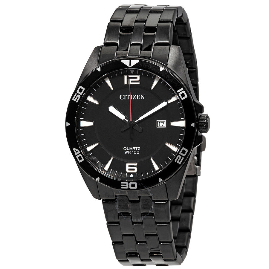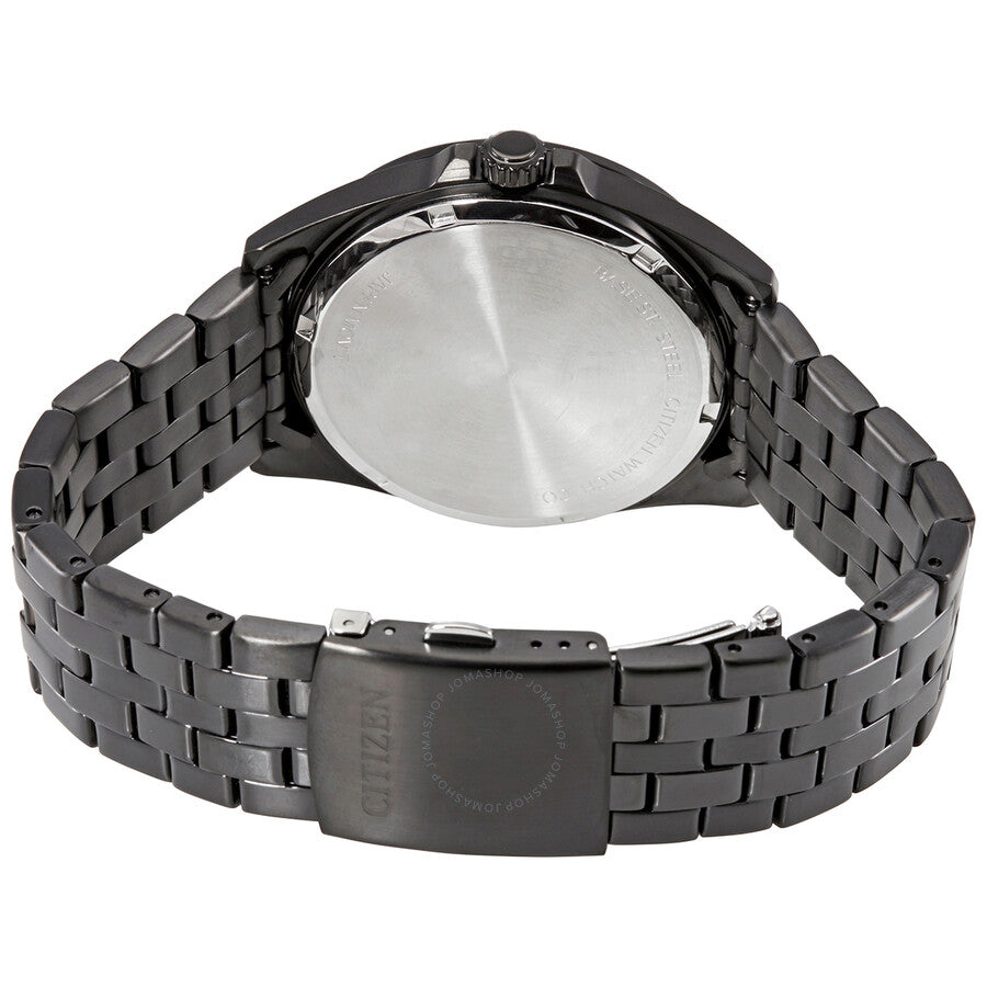 Black-plated stainless steel case and bracelet. Black-plated bezel. Black dial with luminous black hands and index hour markers. Arabic numerals appear at the 6 and 12 o'clock positions. Minute markers around the outer rim. Dial Type: Analog. Luminescent hands and markers. Date display at the 3 o'clock position. Quartz movement. Scratch resistant mineral crystal. Pull / push crown. Solid case back. Round case shape. Case size: 44 mm. Case thickness: 10 mm. Band width: 22 mm. Fold over clasp with a push button release. Water resistant at 100 meters / 330 feet. Functions: date, hour, minute, second. Casual watch style. Citizen Quartz Black Dial Black-plated Men's Watch BI5055-51E.