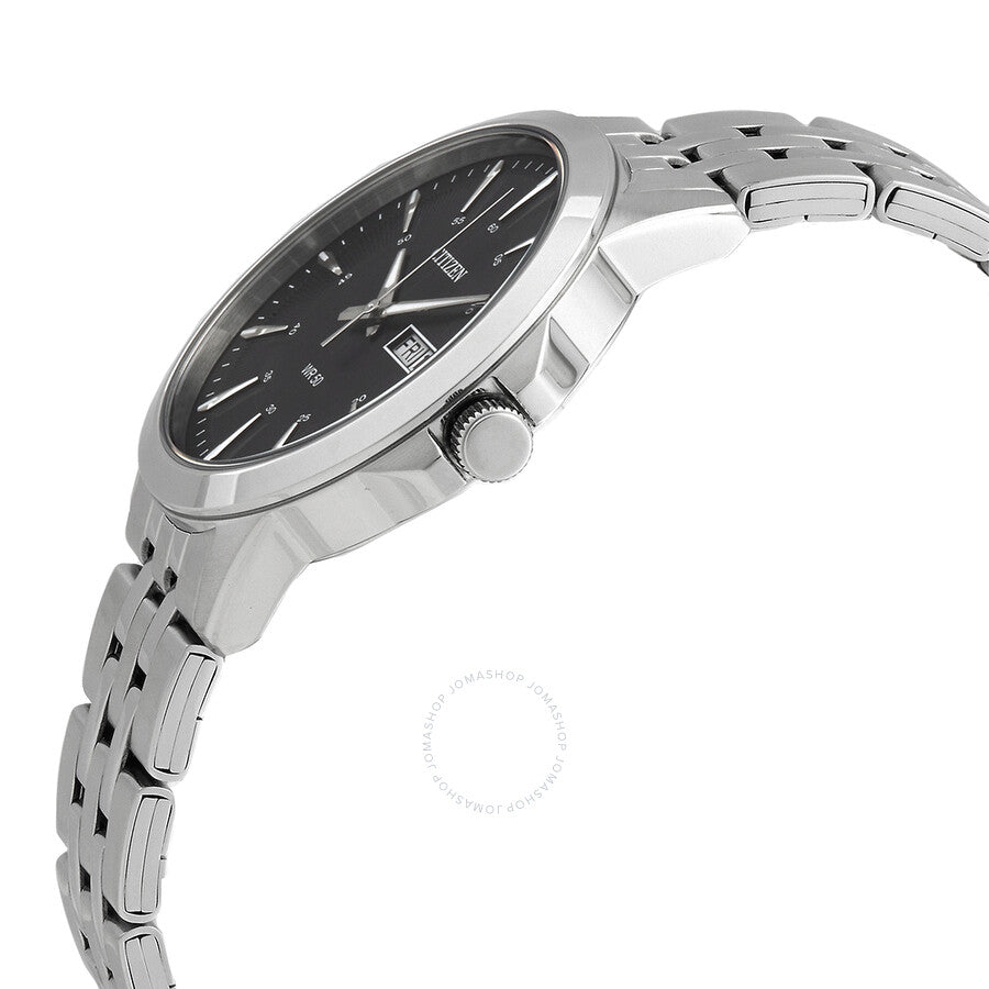 Stainless steel case with a stainless steel bracelet. Fixed stainless steel bezel. Black dial with luminous silver-tone hands and index hour markers. Arabic numeral minute markers (at 5 minute intervals). Minute markers around the outer rim. Dial Type: Analog. Luminescent hands and markers. Day of the week and date display at the 3 o'clock position. Quartz movement. Scratch resistant mineral crystal. Pull / push crown. Solid case back. Round case shape. Case size: 41 mm. Case thickness: 10 mm. Band width: 20 mm. Fold over clasp with a push button release. Water resistant at 50 meters / 165 feet. Functions: date, day, hour, minute, second. Dress watch style. Watch label: Japan Movt. Citizen Quartz Black Dial Stainless Steel Men's Watch BF2011-51E.