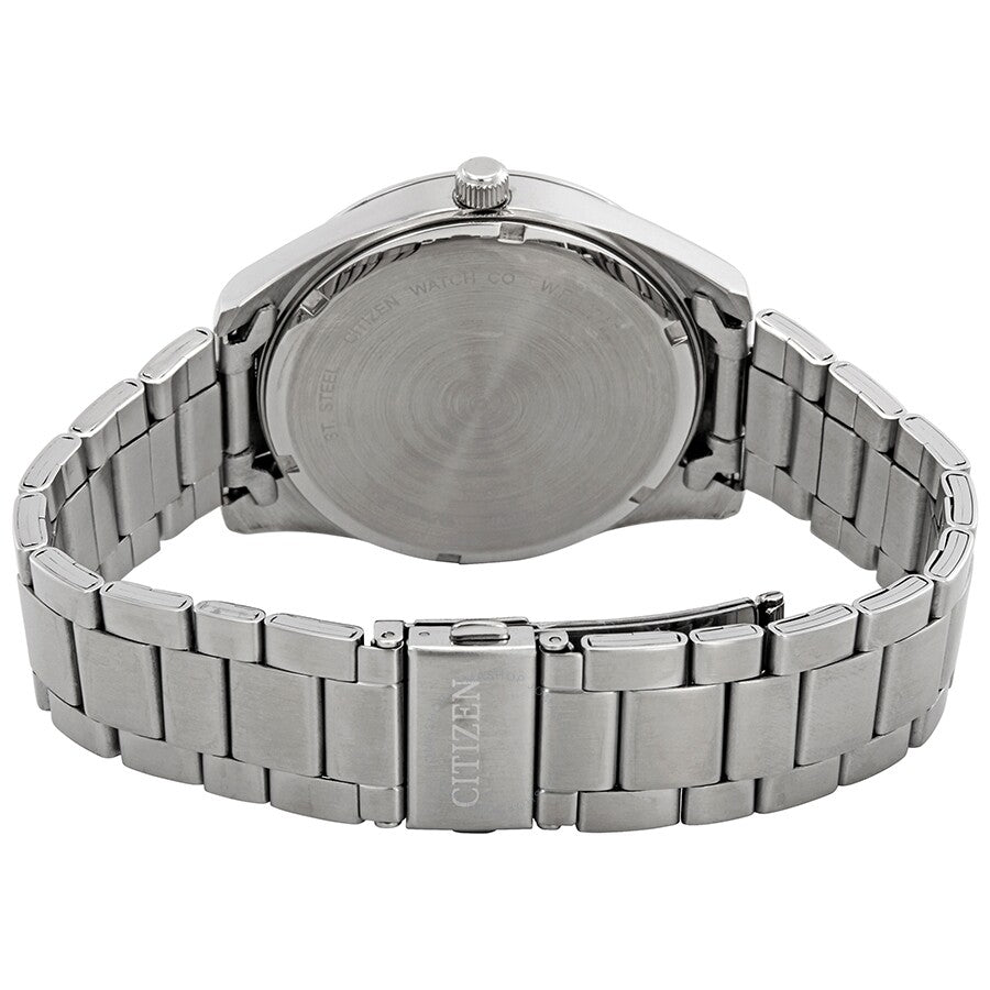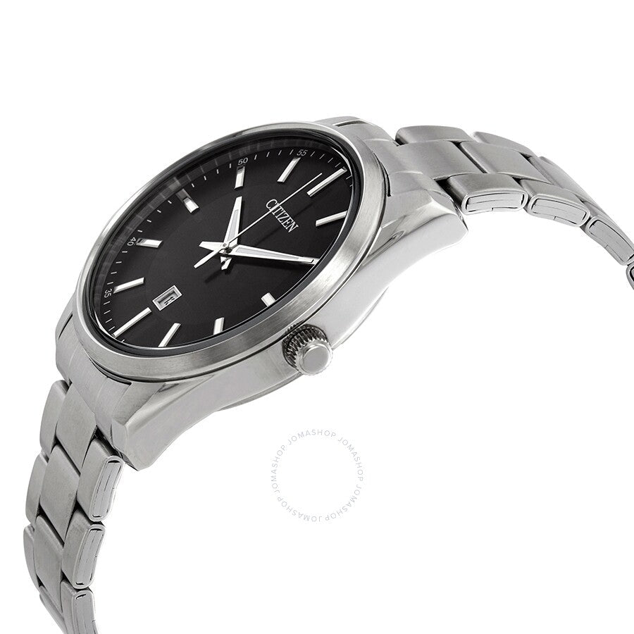 Stainless steel case with a stainless steel bracelet. Fixed stainless steel bezel. Black dial with luminous silver-tone hands and index hour markers. Arabic numeral minute markers (at 5 minute intervals). Minute markers around the outer rim. Dial Type: Analog. Luminescent hands and markers. Date display above the 6 o'clock position. Quartz movement. Scratch resistant mineral crystal. Pull / push crown. Solid case back. Round case shape. Case size: 42 mm. Case thickness: 9.5 mm. Band width: 20 mm. Fold over clasp with a safety release. Water resistant at 30 meters / 100 feet. Functions: date, hour, minute, second. Casual watch style. Watch label: Japan Movt. Citizen Quartz Black Dial Stainless Steel Men's Watch BI1030-53E.
