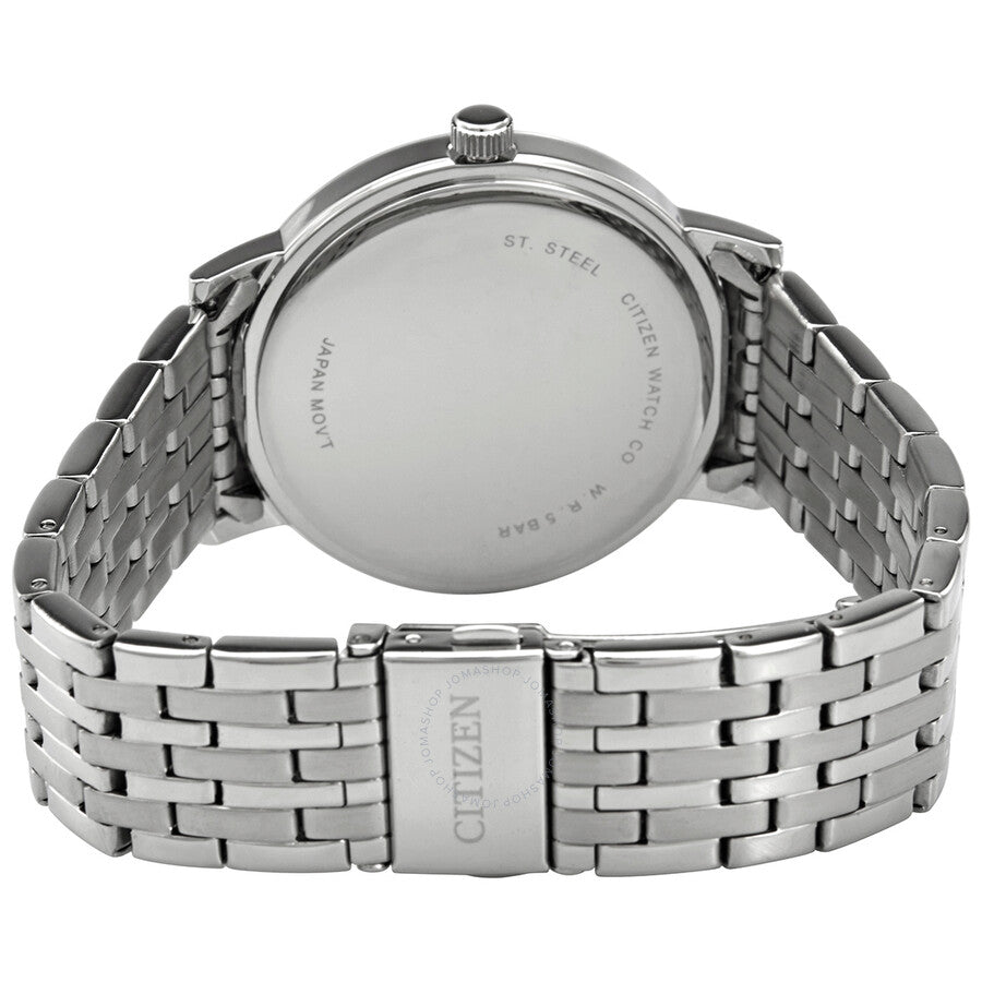 Stainless steel case with a stainless steel bracelet. Fixed stainless steel bezel. Black dial with silver-tone hands and index hour markers. Dial Type: Analog. Date display at the 3 o'clock position. Quartz movement. Scratch resistant mineral crystal. Pull / push crown. Solid case back. Round case shape. Case size: 39 mm. Case thickness: 8 mm. Band width: 20 mm. Fold over clasp with a push button release. Water resistant at 50 meters / 165 feet. Functions: date, hour, minute, second. Casual watch style. Citizen Quartz Black Dial Stainless Steel Men's Watch BI5070-57H.
