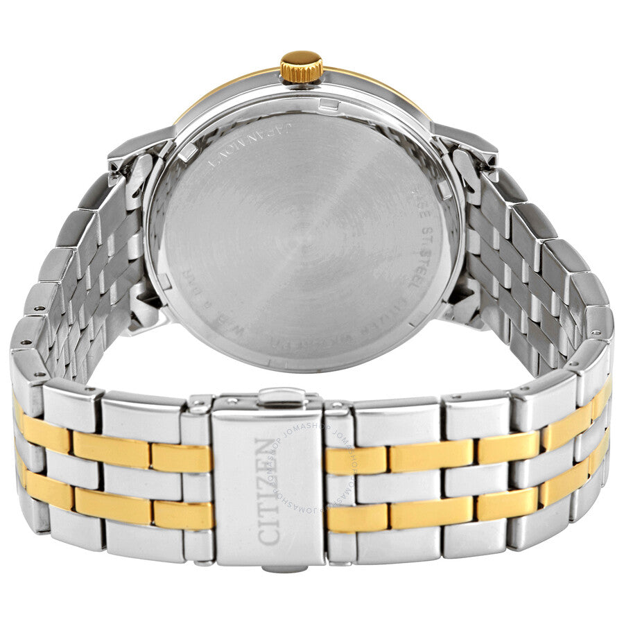 Stainless steel case with a two-tone (silver-tone and gold-tone) stainless steel bracelet. Fixed gold-tone bezel. Blue dial with gold-tone hands and index hour markers. Roman numerals appear at the 3, 6, 9 and 12 o'clock positions. Minute markers around the outer rim. Dial Type: Analog. Small seconds seconds. Citizen caliber 1045 quartz movement. Scratch resistant mineral crystal. Pull / push crown. Solid case back. Round case shape. Case size: 39 mm. Case thickness: 9.8 mm. Band width: 20 mm. Fold over clasp with a push button release. Water resistant at 50 meters / 165 feet. Functions: hour, minute. Casual watch style. Citizen Quartz Blue Dial Two-tone Men's Watch BE9176-76L.