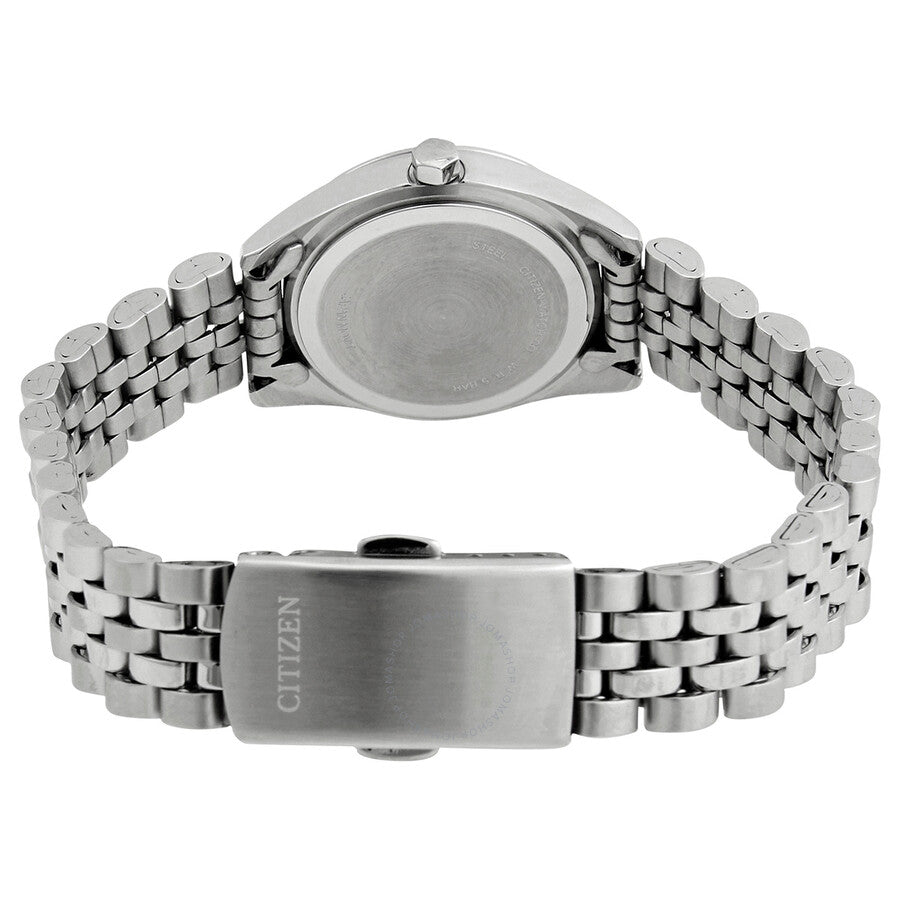 Stainless steel case with a stainless steel bracelet. Fixed stainless steel set with crystals bezel. Mother of pearl dial with silver-tone hands and index hour markers. Minute markers around the outer rim. Dial Type: Analog. Luminescent hands. Date display at the 3 o'clock position. Citizen calibre G011 quartz movement. Scratch resistant mineral crystal. Pull / push crown. Solid case back. Round case shape, case size: 26 mm, case thickness: 8 mm. Band width: 13 mm. Fold over with push button clasp. Water resistant at 50 meters / 165 feet. Functions: date, hour, minute, second. Dress watch style. Watch label: Japan Movt. Citizen Quartz Crystal Mother of Pearl Dial Ladies Watch EU6060-55D.