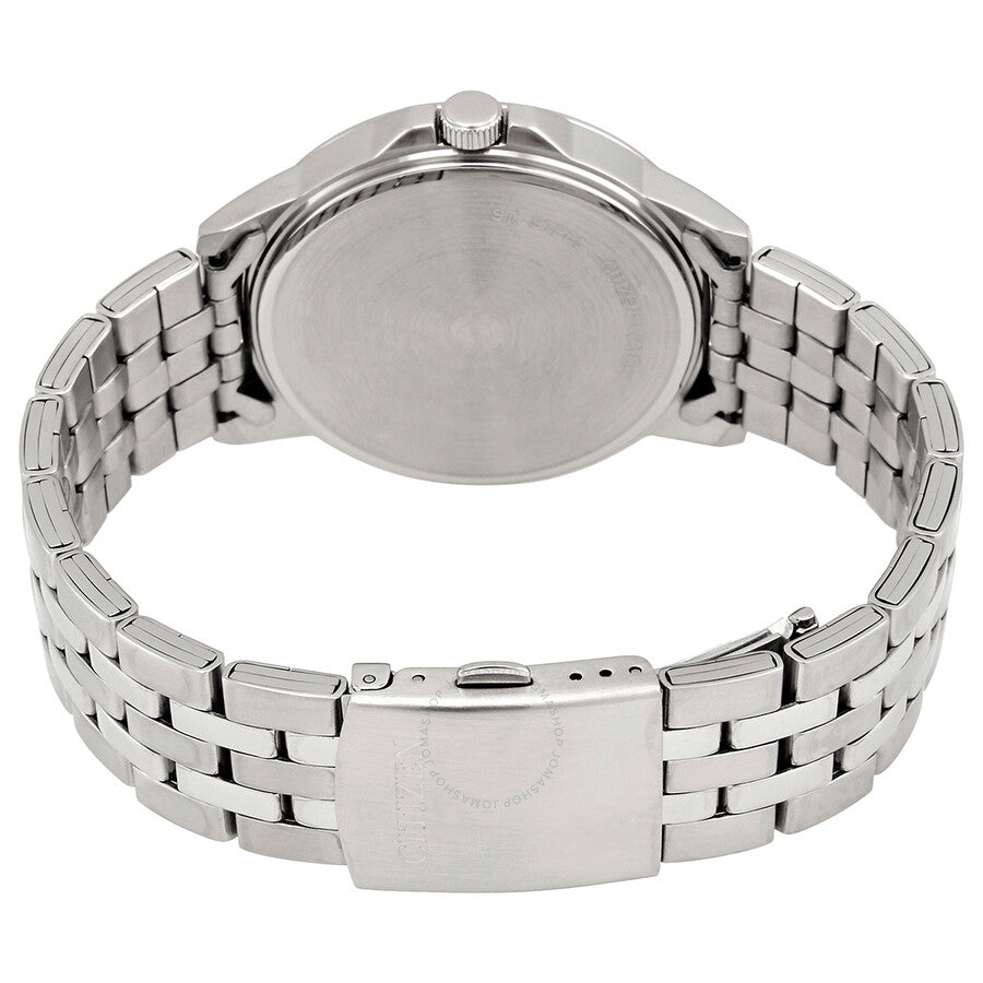 Stainless steel case and bracelet. Fixed stainless steel bezel. Silver dial with luminous silver-tone hands and index hour markers. Arabic numeral minute markers (at 5 minute intervals). Minute markers around the outer rim. Dial Type: Analog. Luminescent hands and markers. Day of the week and date display at the 3 o'clock position. Citizen caliber 1502 quartz movement. Scratch resistant mineral crystal. Pull / push crown. Solid case back. Round case shape. Case size: 41 mm. Case thickness: 9 mm. Band width: 21 mm. Fold over clasp with a push button release. Water resistant at 50 meters / 165 feet. Functions: date, day, hour, minute, second. Casual watch style. Watch label: Japan Movt. Citizen Quartz Silver Dial Stainless Steel Men's Watch BF2011-51A.