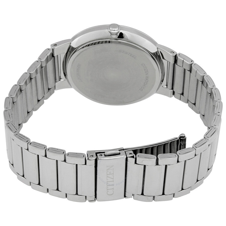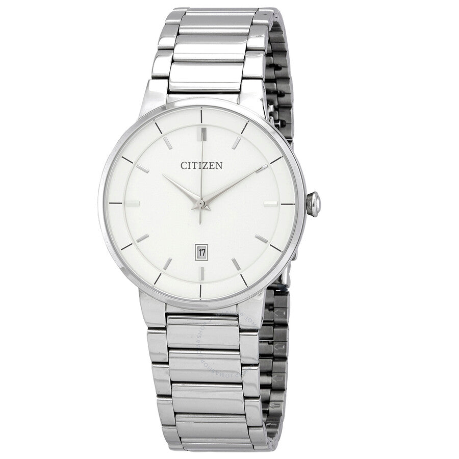 Stainless steel case with a stainless steel bracelet. Fixed stainless steel bezel. White dial with silver-tone dauphine-style hands and index hour markers. Dial Type: Analog. Date display above the 6 o'clock position. Quartz movement. Scratch resistant mineral crystal. Pull / push crown. Solid case back. Round case shape. Case size: 40 mm. Case thickness: 7 mm. Band width: 22 mm. Fold over clasp with a push button release. Water resistant at 50 meters / 165 feet. Functions: date, hour, minute, second. Casual watch style. Watch label: Japan Movt. Citizen Quartz White Dial Stainless Steel Men's Watch BI5010-59A.