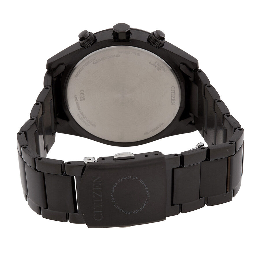 Black IP stainless steel case and bracelet. Fixed black IP stainless steel bezel. Blue dial with rose gold-tone hands and index hour markers. Minute markers around the outer rim. Dial Type: Analog. Date display at the 3 o'clock position. Three sub-dials displaying: 60 second, 24 hour and dual 1/100th of a second/day of the week. Citizen Caliber H800 eco-drive movement. Scratch resistant sapphire crystal. Round case shape, case size: 43 mm, case thickness: 10.2 mm. Fold over clasp with a safety release. Water resistant at 100 meters / 330 feet. Functions: perpetual calendar, chronograph, world time, alarm, date, day, second time zone, hour, minute, second, solar-powered. Radio-controlled Series. Sport watch style. Watch label: Japan Movt. Citizen Radio-Controlled Perpetual Chronograph Blue Dial Men's Watch AT8265-81L.